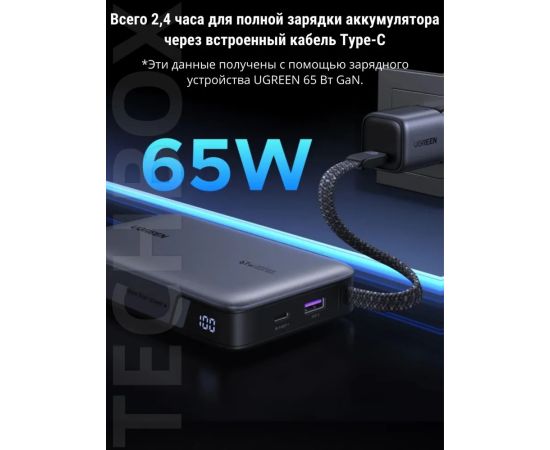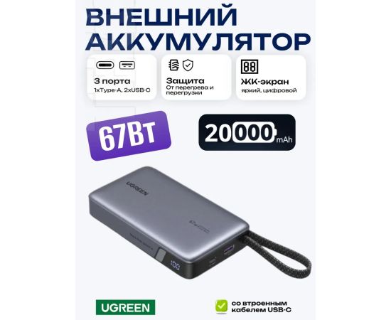 Внешний аккумулятор UGREEN PB550 (55996B) 67W 20000 mAh USB-C&USB-A&USB-C Cable Built-in Cable Space Gray