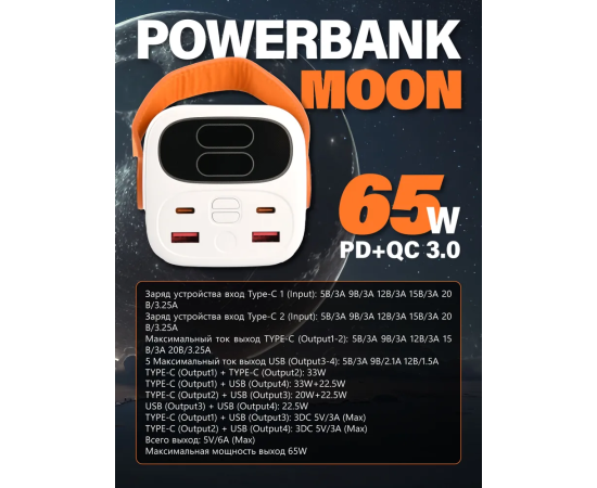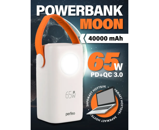 Powerbank Perfeo PF_E1635 Moon 65W 40000 mAh/LED дисплей/PD+QC 3.0/2Type-C/2 USB/,max 65W/White