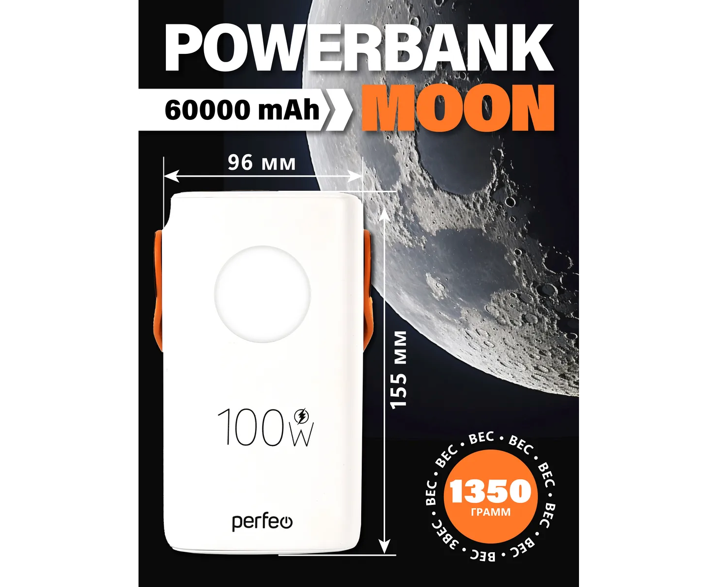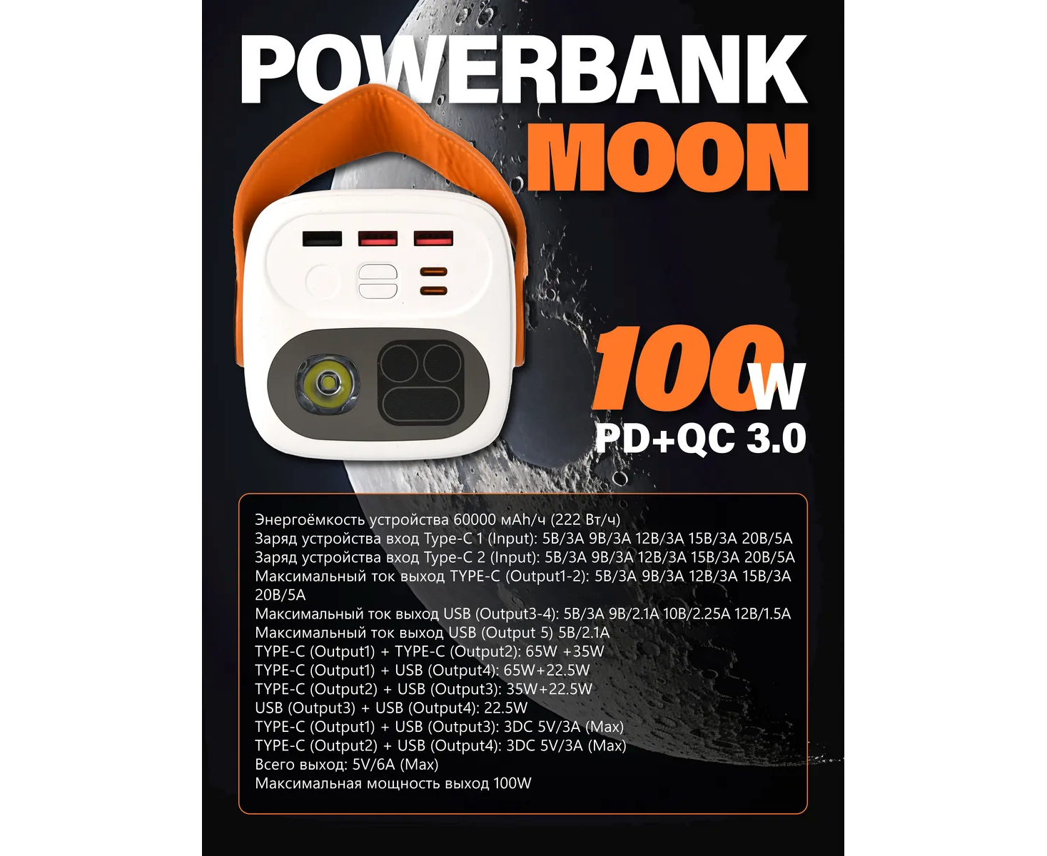 Модель Perfeo Powerbank MOON 100W 60000 mAh/LED дисплей/PD+QC 3.0/2Type-C/3 USB/Выход:5A,max 100W