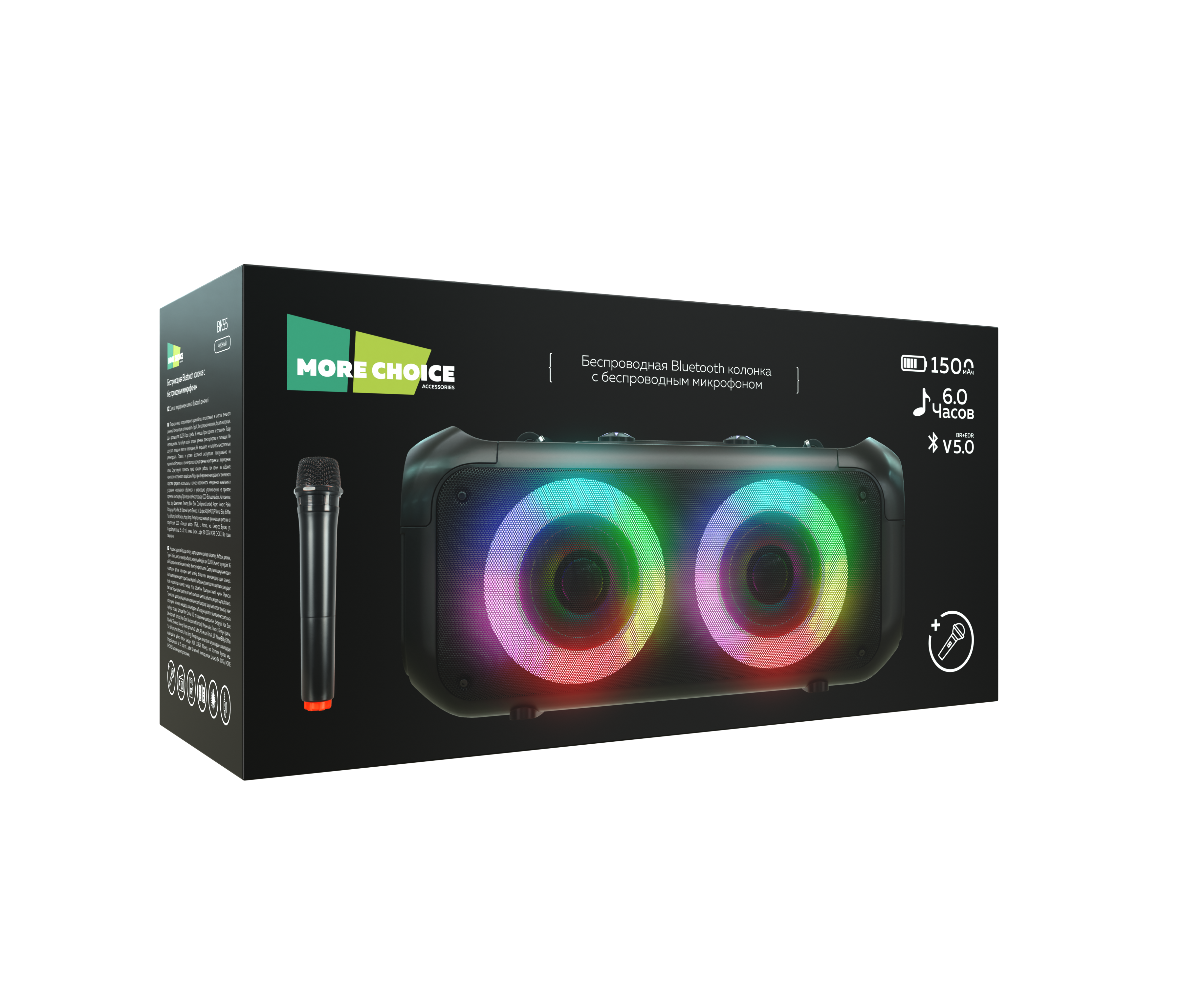 PURE Колонка Bluetooth 5.0 2*10W 1500mAh More Choice BK55 с беспроводным микрофоном (Black)