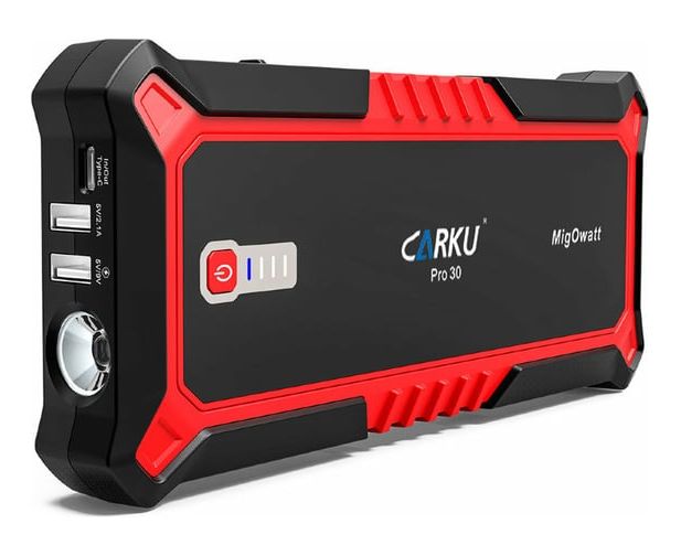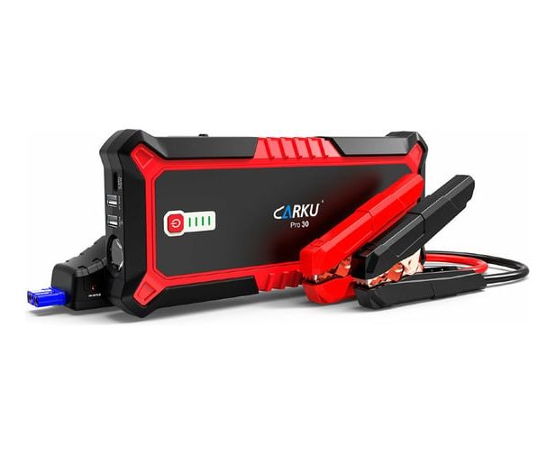 Портативное пуско-зарядное устройство CARKU 17000 mAh jump starter Pro-30 предназначено для запуска двигателей транспортных средств объёмом до 8 литров (бензин) и до 5 литров (дизель). Кроме этого может использоваться для зарядки и питания телефонов, планшетов и прочей электроники. Для этого на корпусе предусмотрены три USB-выхода: USB Type-C 15W, USB QuickCharge, USВ 5В/2,4А. Данная модель так же подходит для питания различных автоприборов, работающих от напряжения 12 В через переходник прикуривателя.