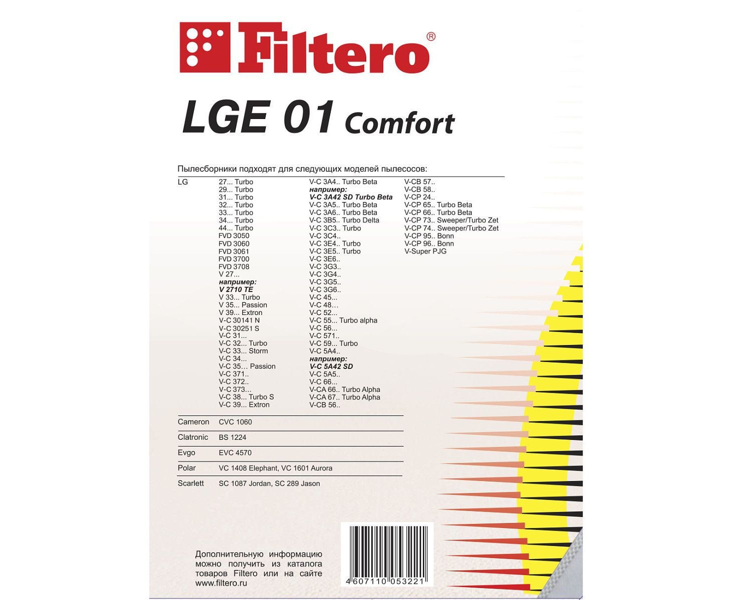 Пылесборники Filtero LGE 01 Comfort подходят для следующих торговых марок пылесосов: LG, CAMERON, CLATRONIC, EVGO, POLAR , SCARLETT