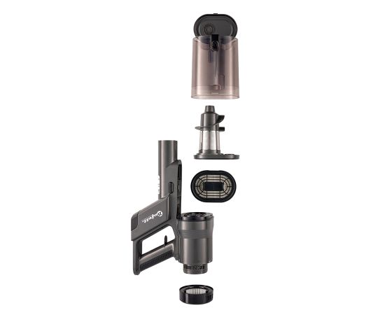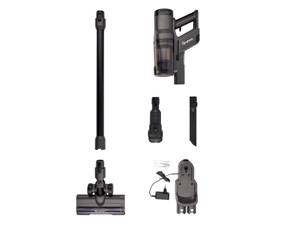 Пылесос вертикальный, НЕРА фильтр с с циклонной фильтрацией, щщетка-насадка для пола, чистящая щетка для мебели, щелевая насадка для труднодоступных мест, большой пылесборник со съемным удобным отсеком, настенная док-станция для зарядки и вертикального хранения устройства и крепления насадок, инструкция