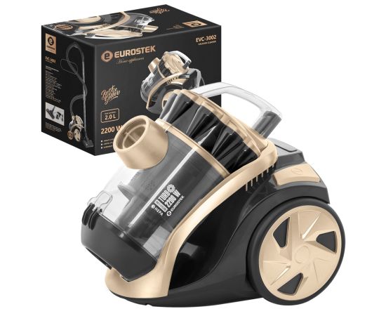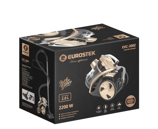 Пылесос МУЛЬТИ-Циклон Eurostek EVC-3002. Многоступенчатая система фильтрации. Внутренний ХЕПА фильтр, внешний ХЕПА фильтр. Максимальная мощность 2200 Вт., мощность всасывания 400 Вт., телескопическая металлическая трубка 80 см, щетка для пола 2 в 1: пол/ковер, щелевая насадка-щетка в комплекте, объем пылесборника 2 литра, индикатор заполнения пылесборника, длина шланга 150 см, длина шнура 4 м, защита от перегрева, автоматическая смотка шнура