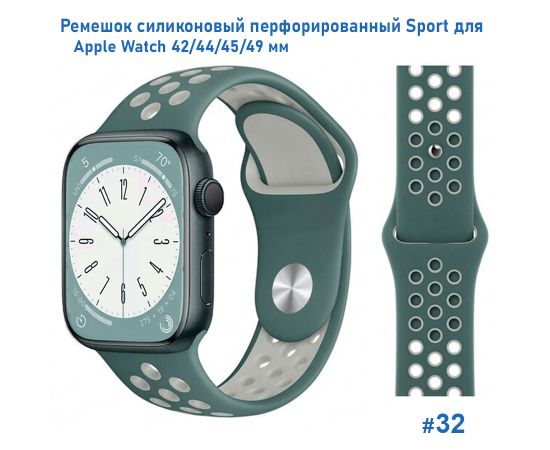 Ремешок силиконовый перфорированный Great Case Sport NK для Apple Watch 42/44/45/49 мм, 235мм, на кнопке, зеленый кактус+серый (32)