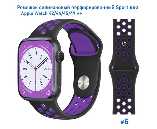 Ремешок силиконовый перфорированный Great Case Sport NK для Apple Watch 42/44/45/49 мм, 235мм, на кнопке, черный+фиолетовый (6)