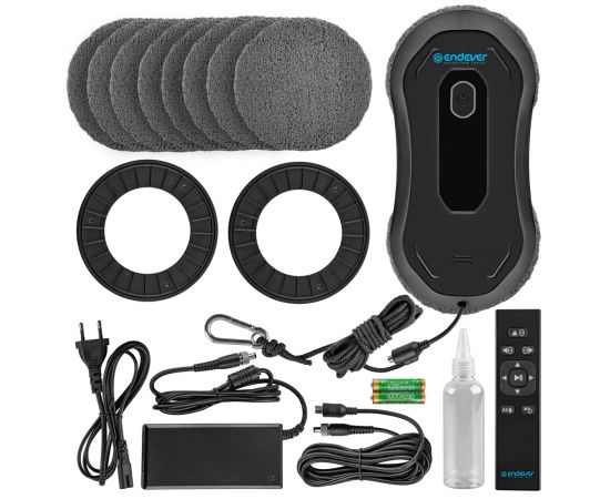 Комплект поставки: робот-мойщик окон, 10 сменных салфеток из микрофибры, 2 запасных диска, страховочный трос, кабель питания, блок питания, пульт управления, батарейки ААА * 2 шт, бутылочка для воды, руководство по эксплуатации, гарантийный талон.