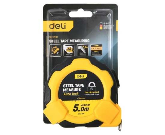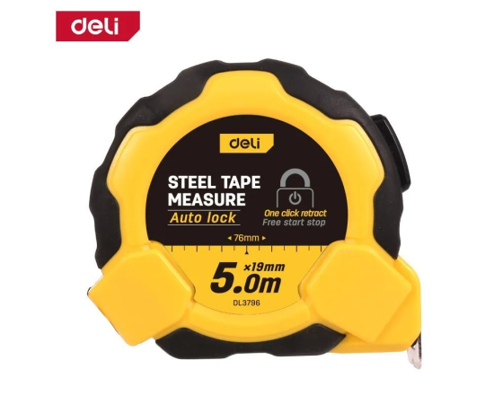 Рулетка Deli DL3796 5м*19мм, Автостоп, ударопрочный корпус, метрическая