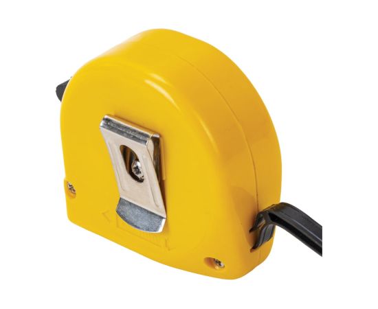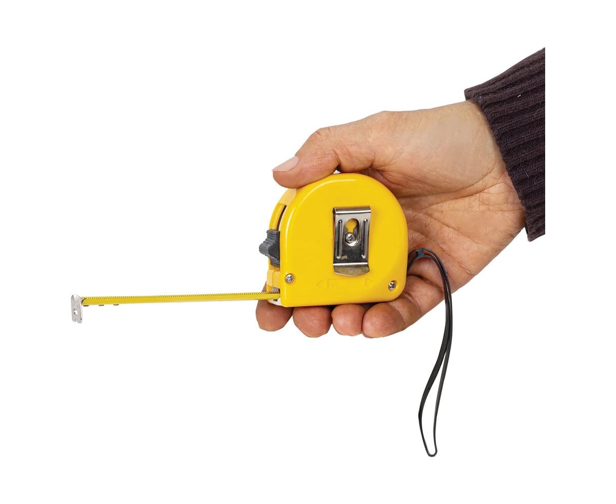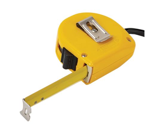 Рулетка оснащена ремешком для ношения на запястье, а также металлической клипсой для крепления на поясе. Эргономичный дизайн с вертикальным фиксатором измерительной ленты позволит использовать рулетку даже одной рукой.