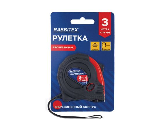 Рулетка измерительная RABBITEX 671356 Professional 3м*16мм, обрезиненный корпус, 3 фиксатора