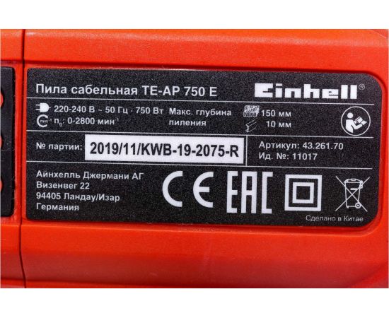 Сабельная пила Einhell TE-AP 750 E (4326170) 750Вт 2800ход/мин