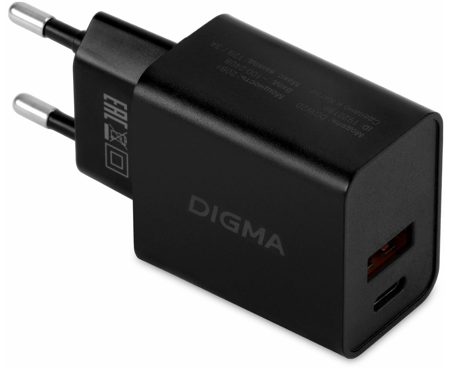 Сетевое зарядное устройство Digma DGW2D 20W 3A+1A (PD+QC) USB-C/USB-A универсальное черный (DGW2D0F110BK)