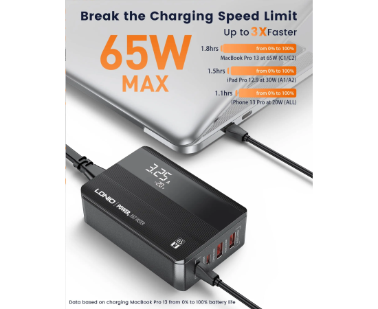 Универсальное зарядное устройство LDNIO A4808Q 65W 2*USB-C 2*USB Чёрный Компактный и портативный настольный блок мощностью зарядки в 65W встроенными протоколами быстрой зарядки делает настольный блок зарядки LDNIO незаменимым в повседневной жизни для зарядки повседневных гаджетов и аксессуаров. USB-C1):5V-3A,9V-3A,12V-3A ,15V-3A,20V-3.25A [65W MAX] (USB-C2): 5V-3A,9V-2.22A,12V-1.67A [20W MAX] (USB-A1):5V-3A,9V-3A,12V-2.5A [30W MAX] (USB-A1):5V-3A,9V-3A,12V-2.5A [30W MAX]