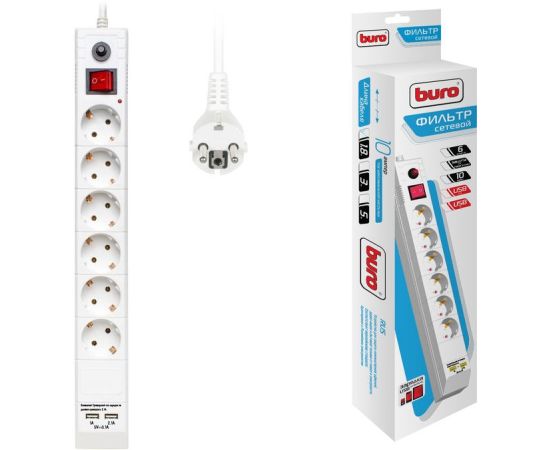 сетевой фильтр, 6 розеток, два USB-порта для зарядки (2.1A + 1A), максимальная нагрузка: 2200 Вт, максимальный ток нагрузки: 10A, максимальная рассеиваемая энергия: 107 Дж, шнур 3м