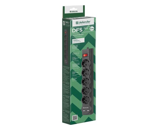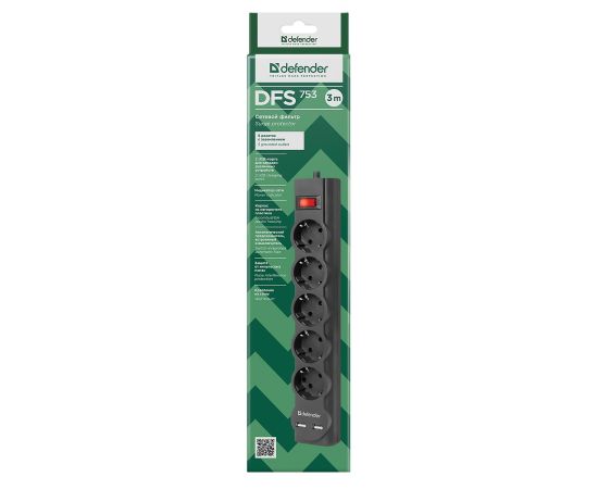 Сетевой фильтр Defender DFS 753, 5 розеток, 3 м (black)(133971)