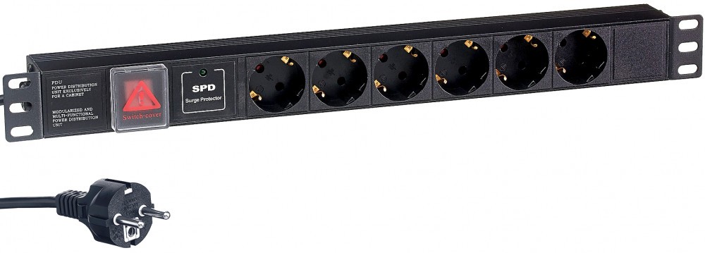 горизонтальный блок розеток, евровилка с заземлением, розетки: 6x Schuko, макс. ток нагрузки 16A, фильтр защиты, выключатель с подсветкой, стандарт VDE, EAC, кабель 2м
