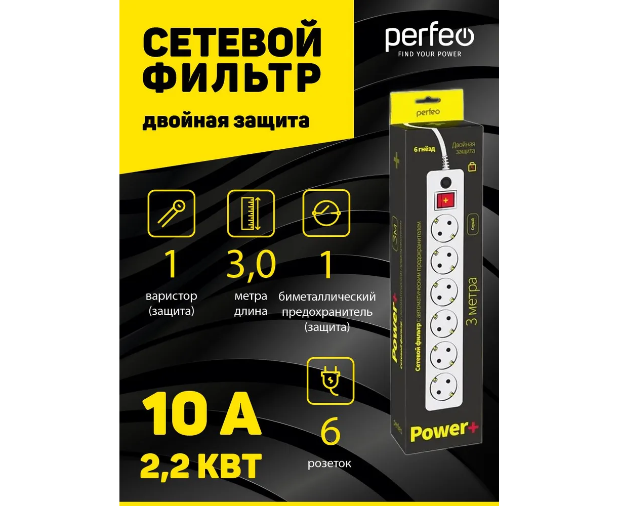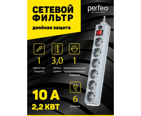 Сетевой фильтр Perfeo "POWER+", 3,0м, 6 розеток, (PF-PP-6/3,0-G), серый