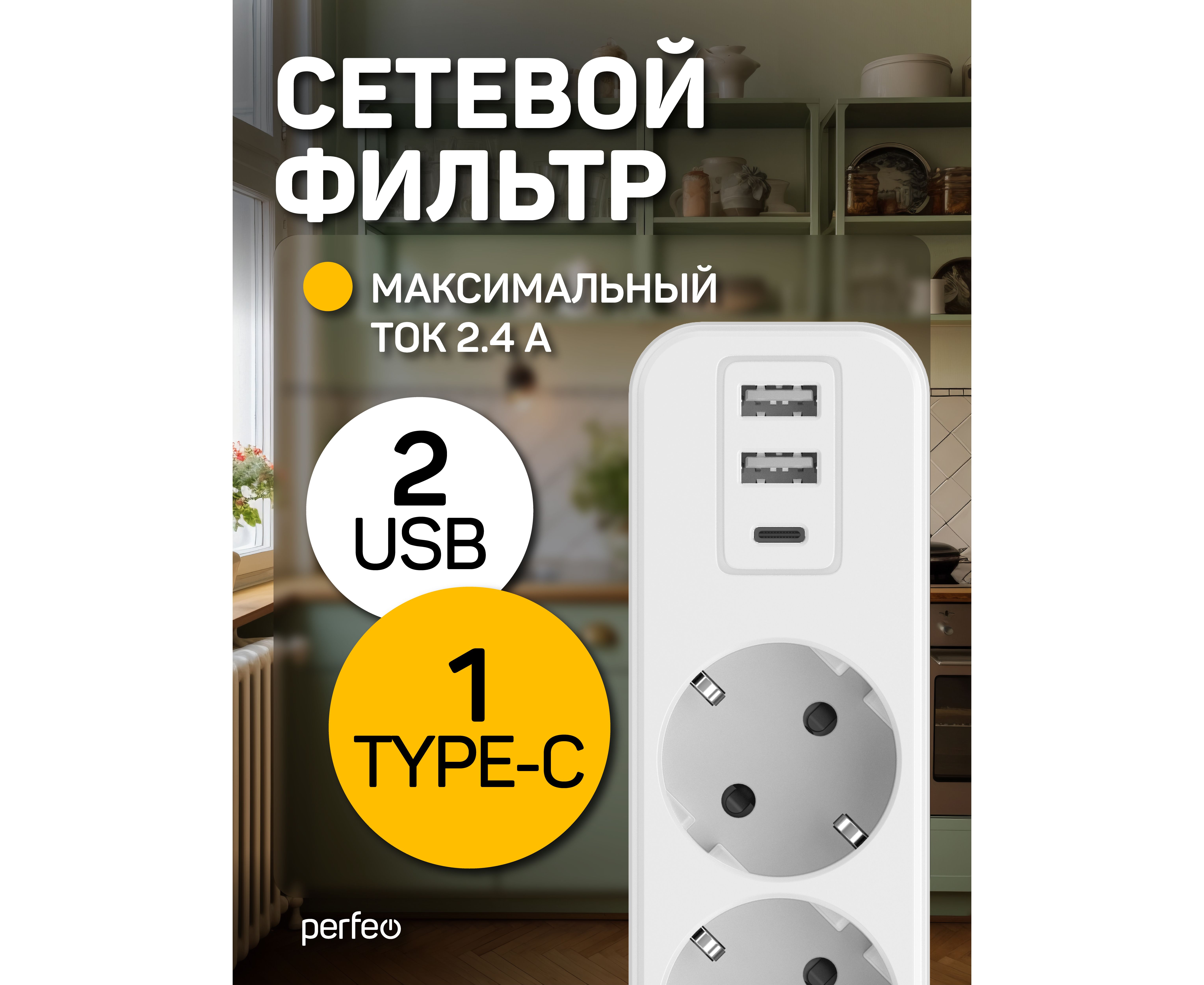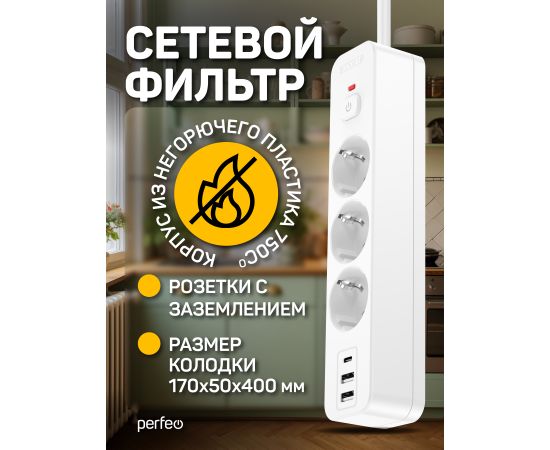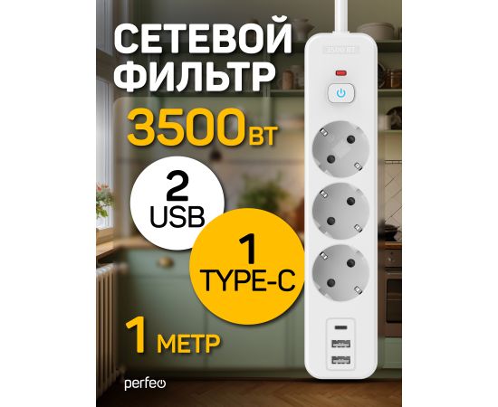Сетевой фильтр Perfeo "REAL HOME" 1,0м, 3 розетки, 2USB+1TYPE-C, 16А, 3500 Вт,тройная защита,белый.
