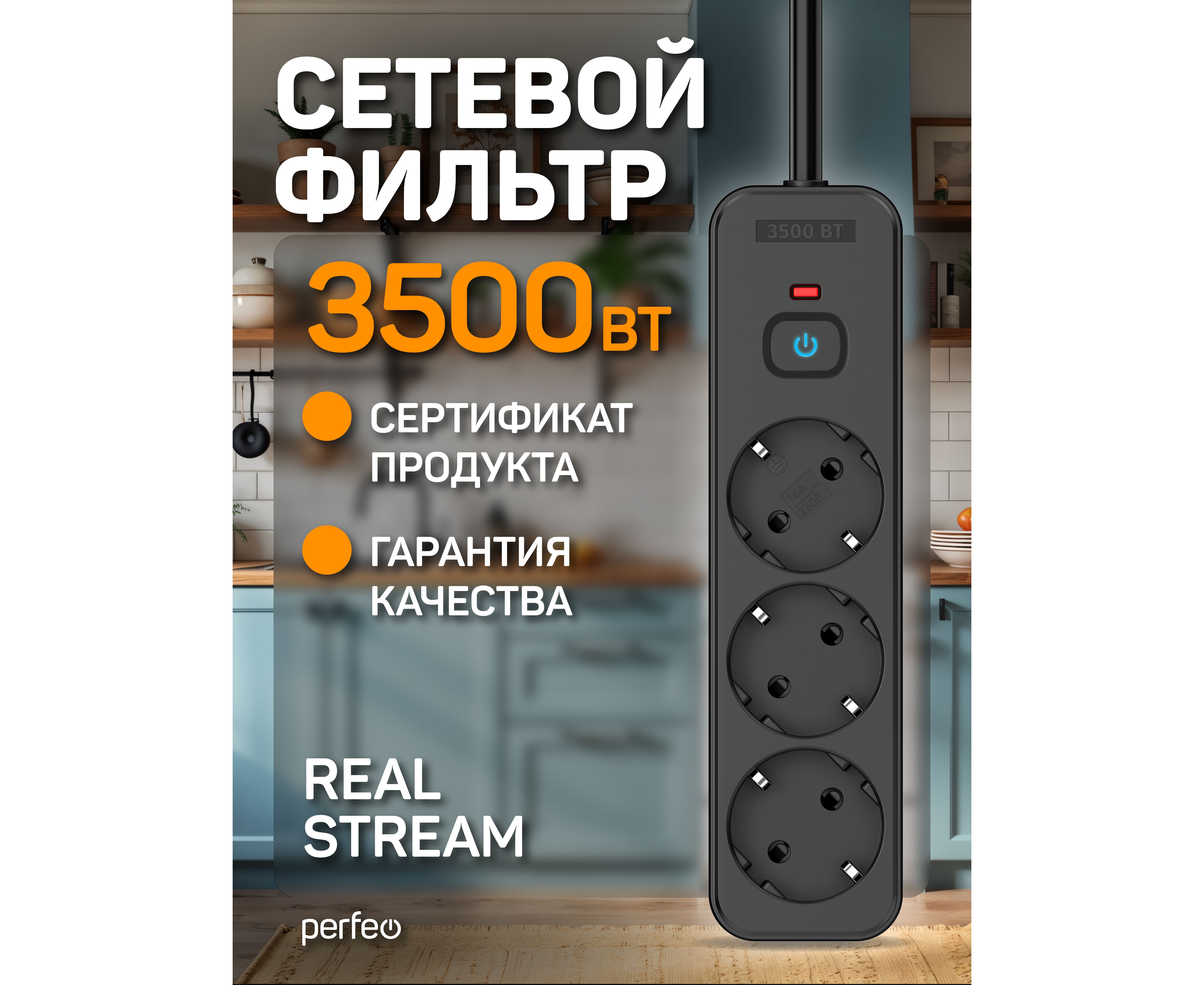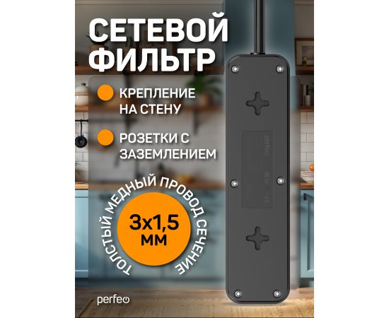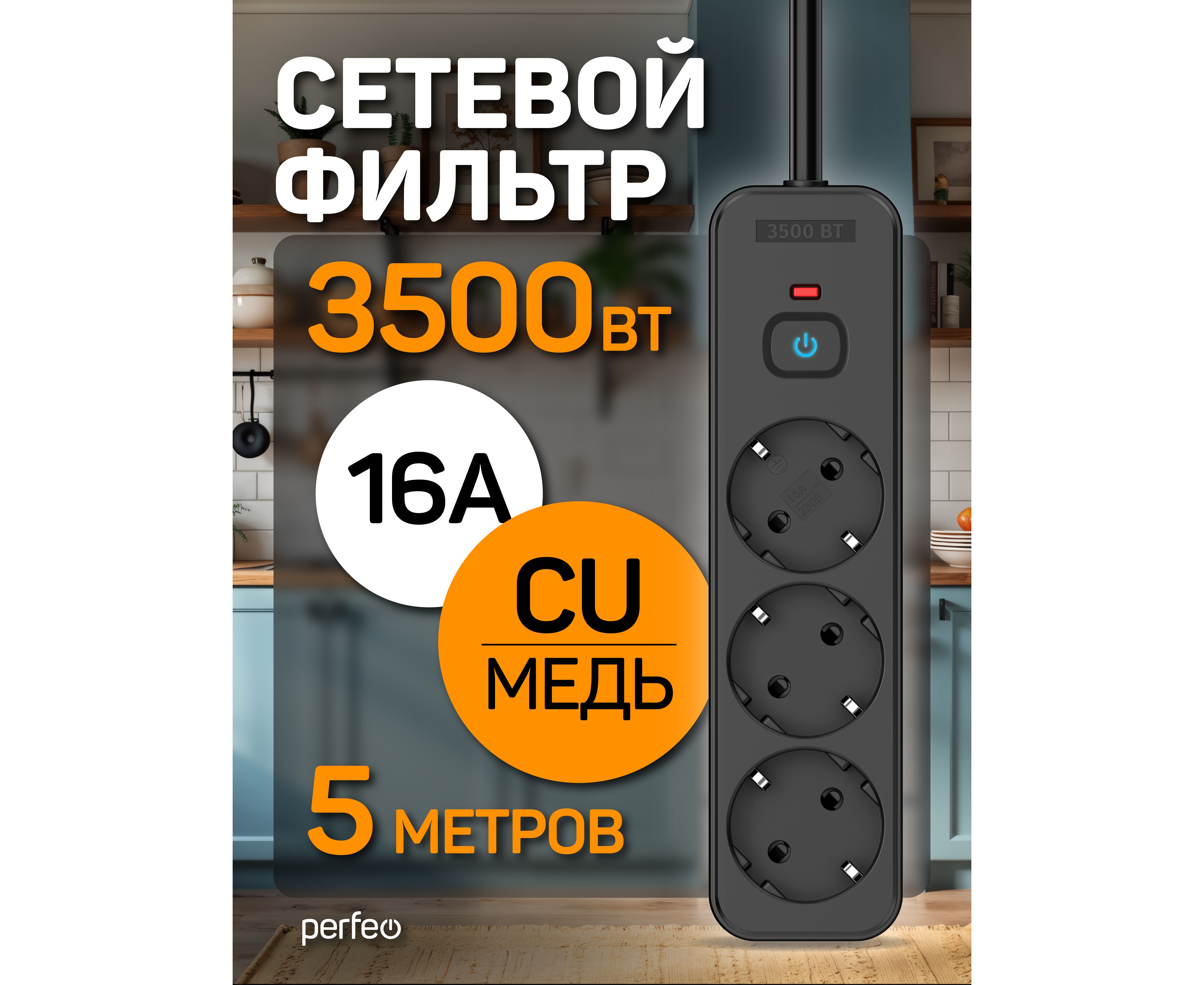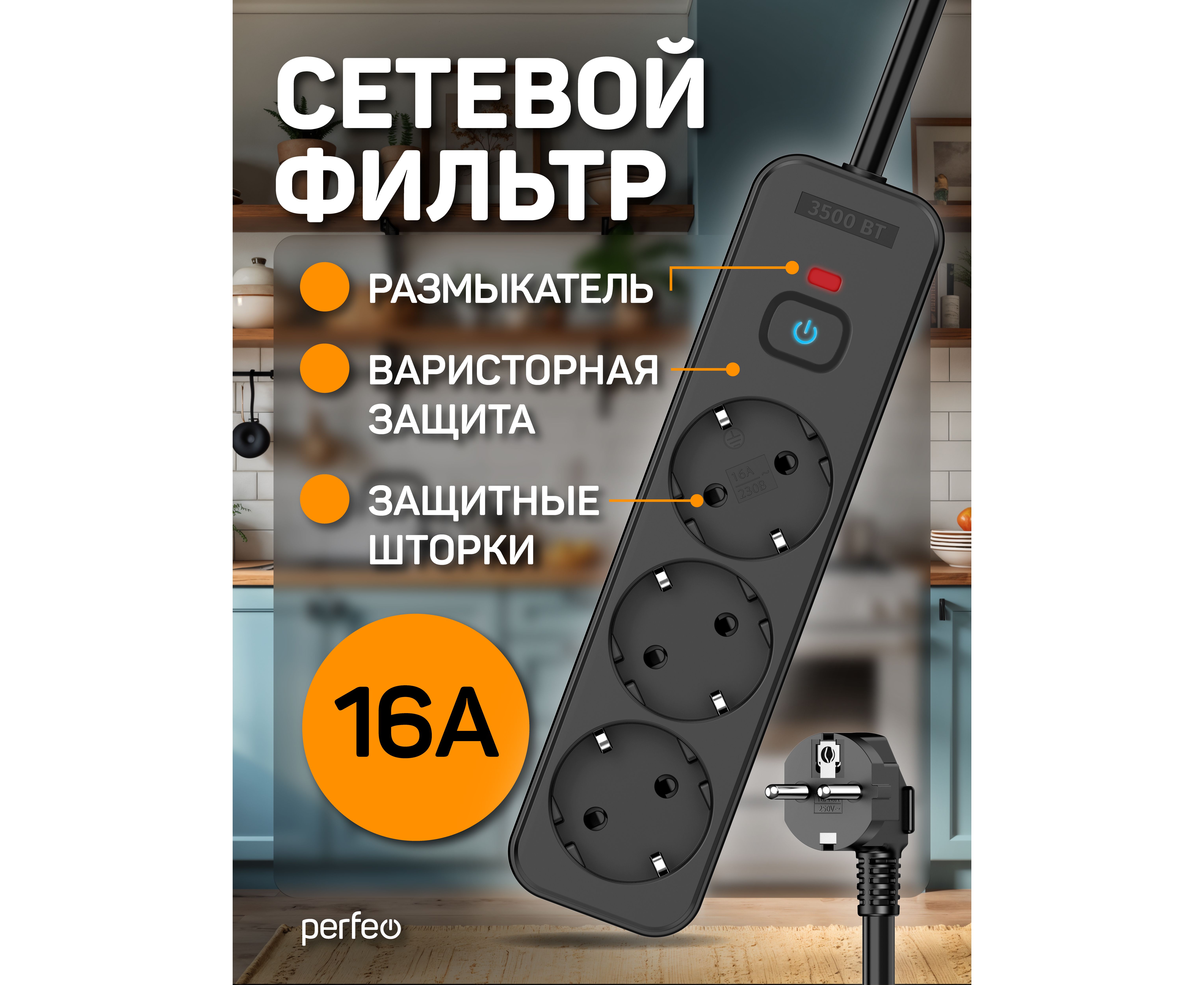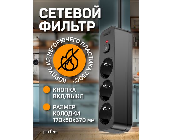 Сетевой фильтр Perfeo "REAL HOME" 5,0м, 3 розетки, 16А, 3500 Вт, тройная защита, черный