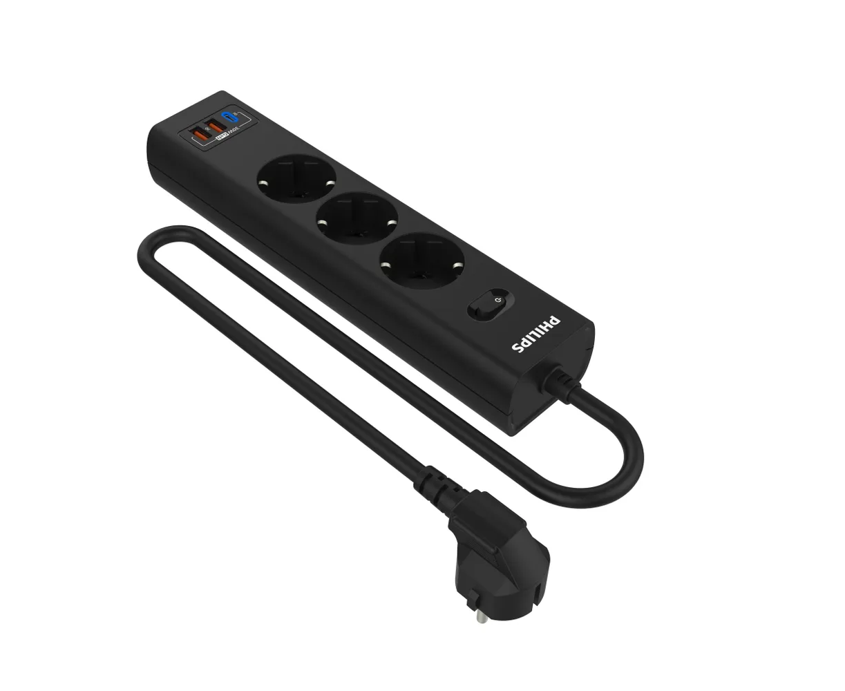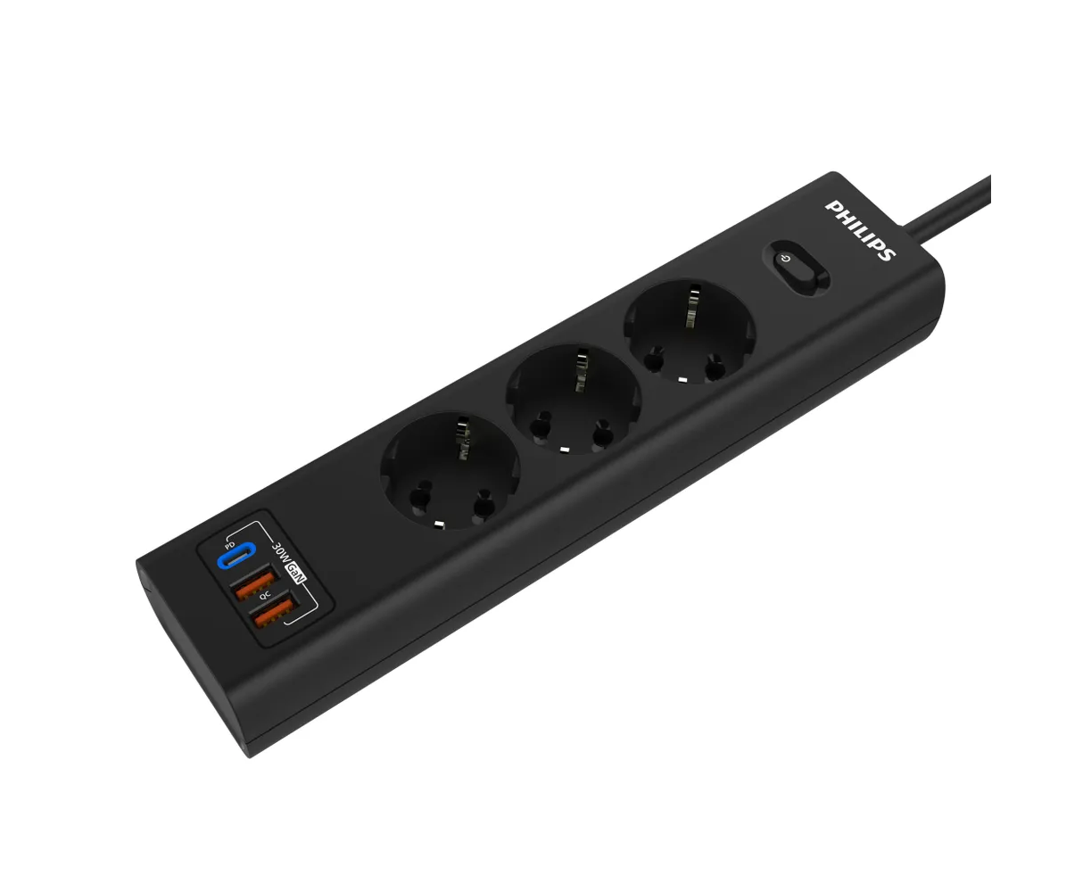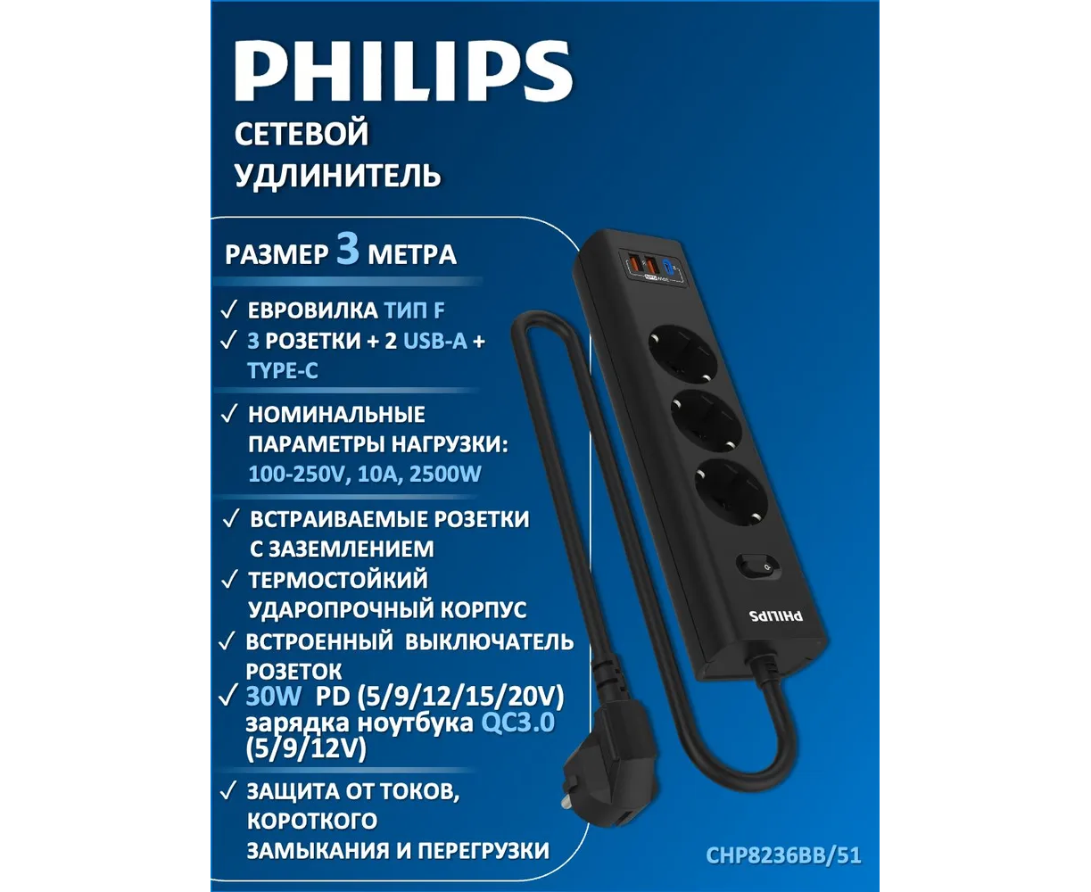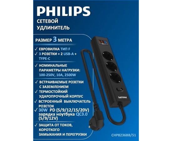 Сетевой фильтр удлинитель Philips CHP8236BB/51 представляет собой удобное устройство, которое позволяет подключать несколько устройств к одной розетке. Этот пилот удлинитель оснащен 3 розетками и 2 USB-А, а также одним портом Type-C, что обеспечивает возможность подключения различных электронных устройств, можно использовать как фильтр для компьютера, а также хорошо подойдет как удлинитель для гирлянды, поэтому он является многофункциональным. Длина разветвителя электрического составляет 3 метра, что позволяет свободно располагать подключенные устройства в нужном месте. Важным преимуществом розетки с выключателем является наличие заземления, которое обеспечивает безопасность и защиту от перегрузок. Тройник с usb 3.0 обладает многофункциональностью, позволяя подключать не только электрические приборы, но и заряжать устройства с помощью USB-портов. Сетевой фильтр Philips обладает передовой технологией быстрой зарядки QC 3.0 - Смартфон непрерывно посылает зарядному устройству информацию о состоянии аккумулятора. На основании этой информации блок питания регулирует выходную мощность, изменяя напряжение и силу тока. Также, благодаря новейшей технологии GaN, этот удлинитель предлагает высокую мощность, занимая при этом минимум места. Сетевые зарядные устройства, в которых используется технология GaN (нитрид галлия), потребляют меньше электрических компонентов и обладают лучшей теплоотдачей. Черный цвет разветвителя с type c придает ему стильный и современный вид, а прочный корпус обеспечивает долговечность и надежность использования. Этот удлинитель силовой идеально подходит для использования дома или в офисе, где требуется подключение и зарядка сразу нескольких устройств. Идеально подойдет для использования дома, гаража, склада, офиса.
