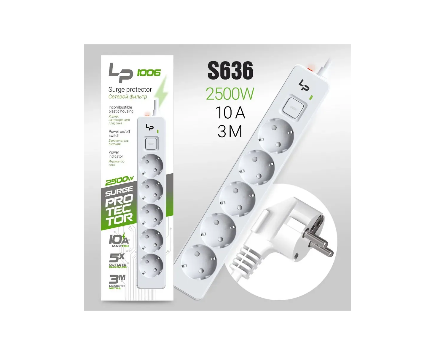 Сетевой фильтр-удлинитель LP LP1006 5розеток С/З 10А с выкл. 3м white