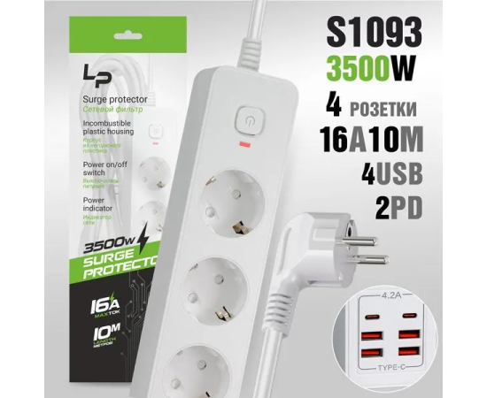 Сетевой фильтр-удлинитель LP LP1018 4розетки С/З 4USB + 2PD 16A с выкл. 10м white