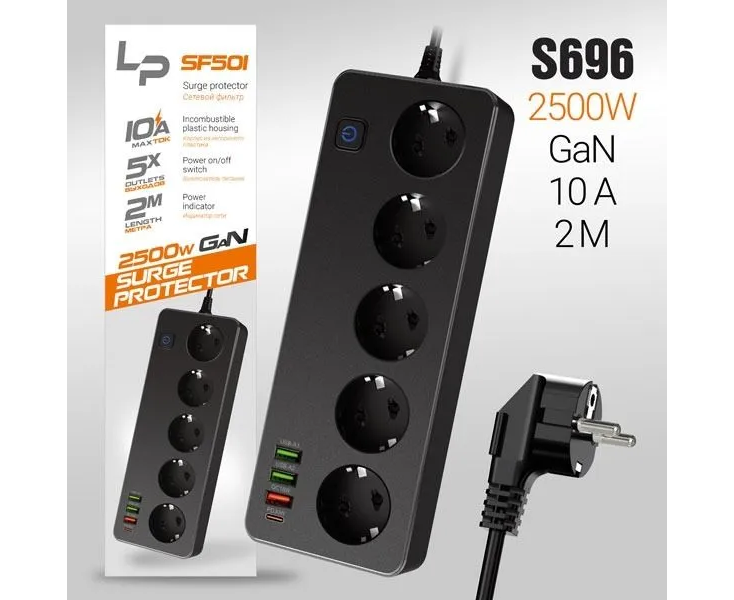 Сетевой фильтр-удлинитель LP SF501 5р 3USB A+C Gan 45W/10А 2500W 2м black