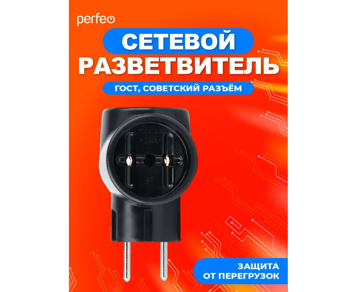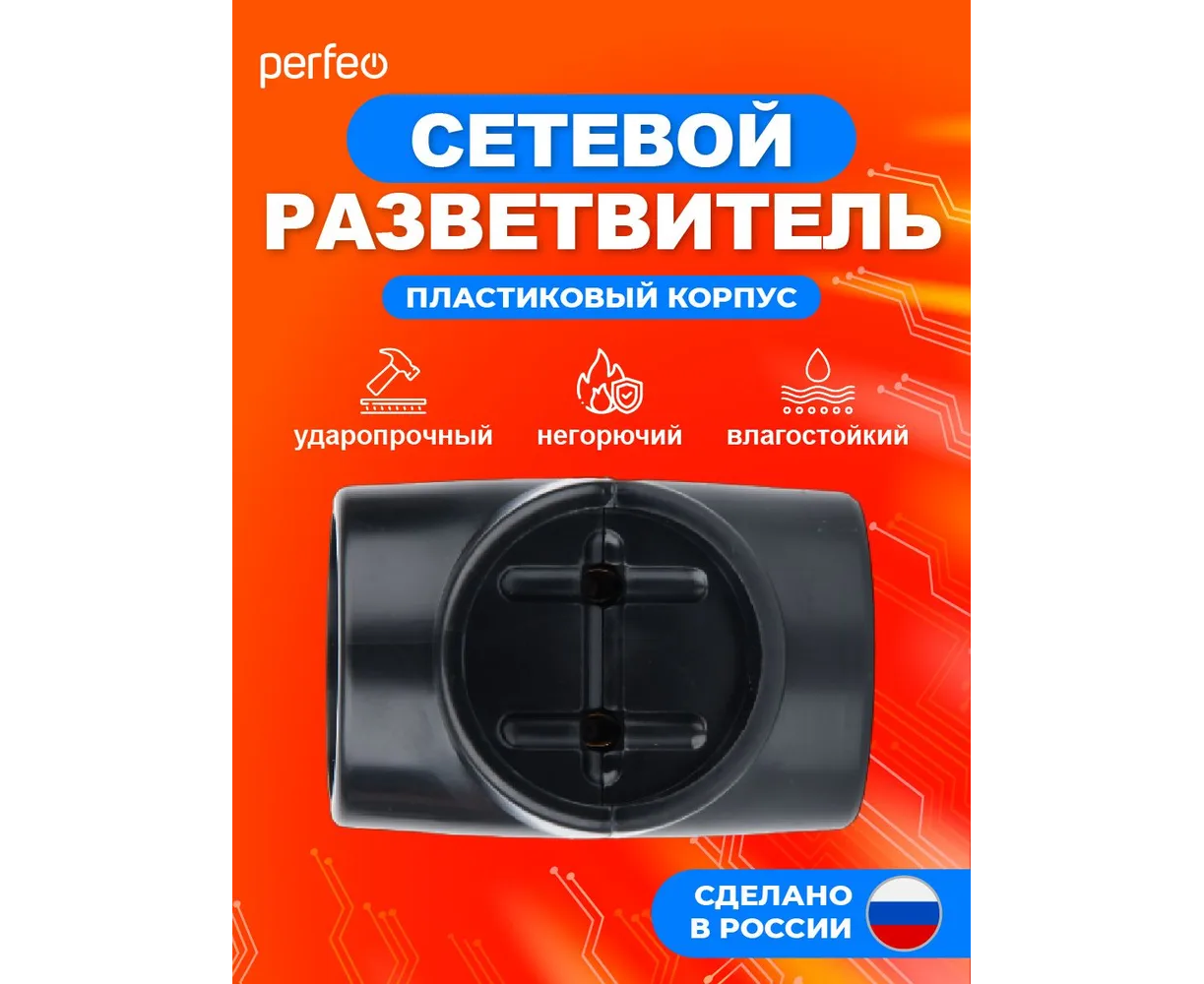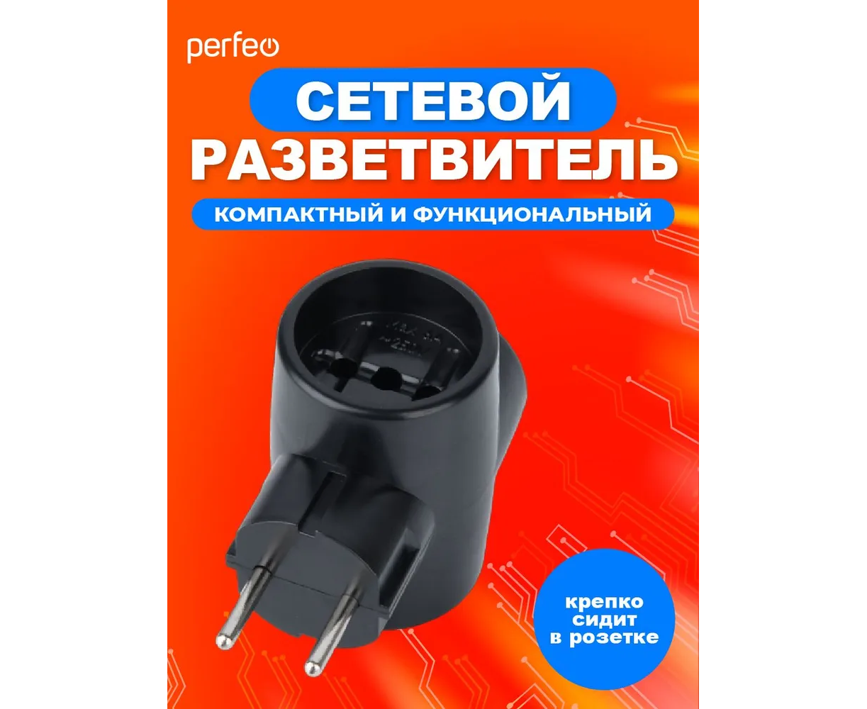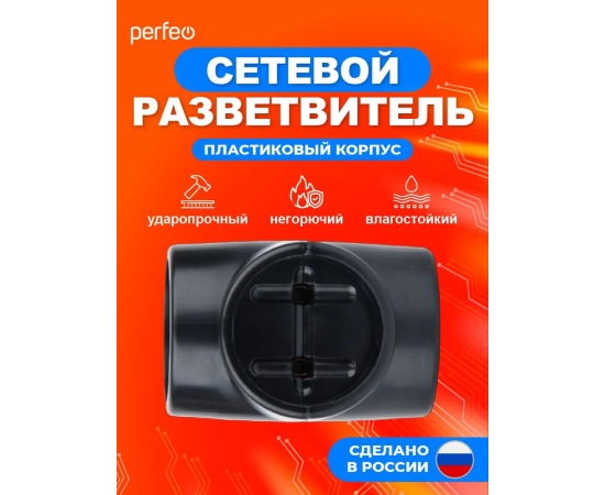 Сетевой разветвитель Perfeo "RU POWER'' 3 гнезда, 6А, без заземления, (3Т), черный