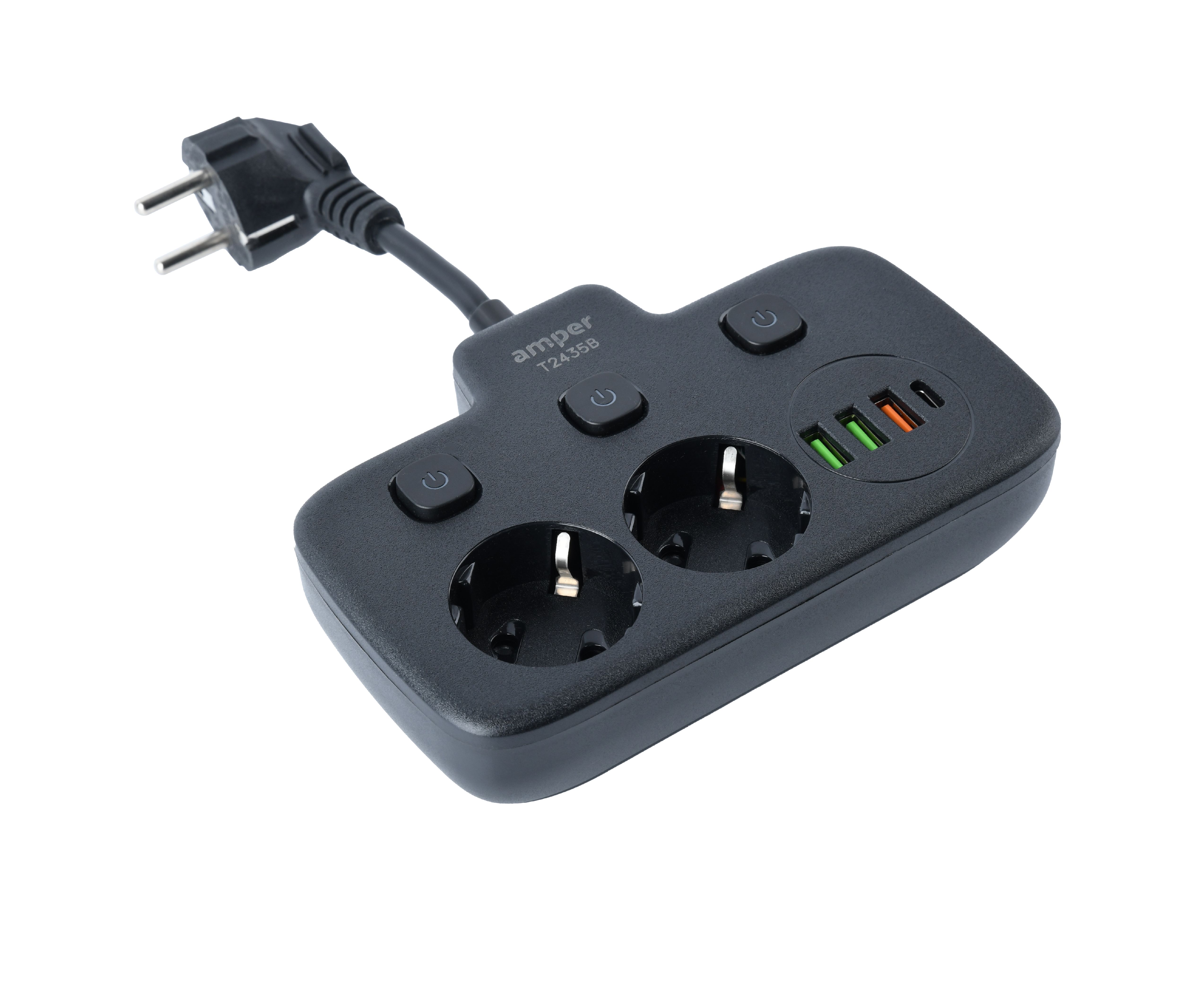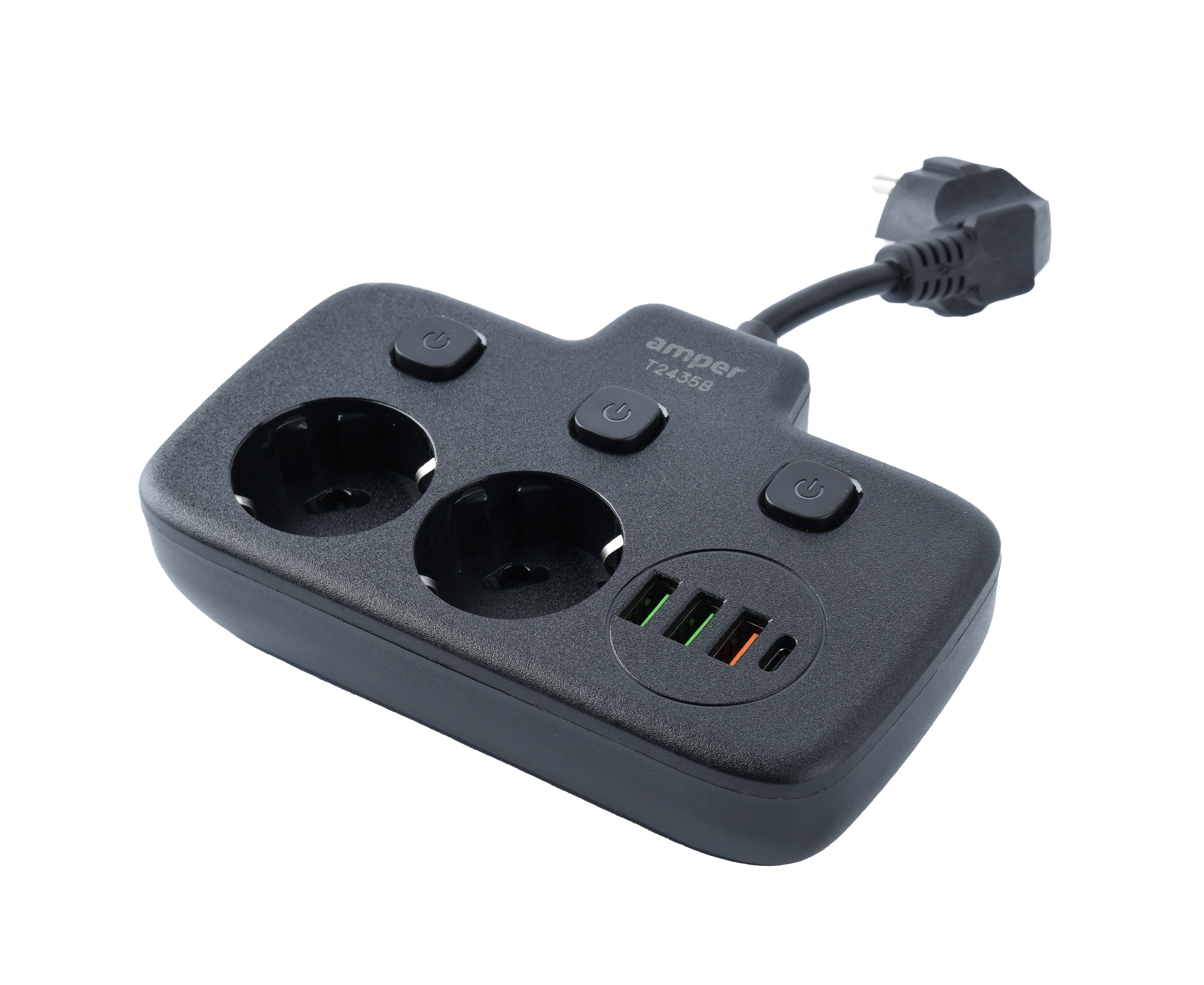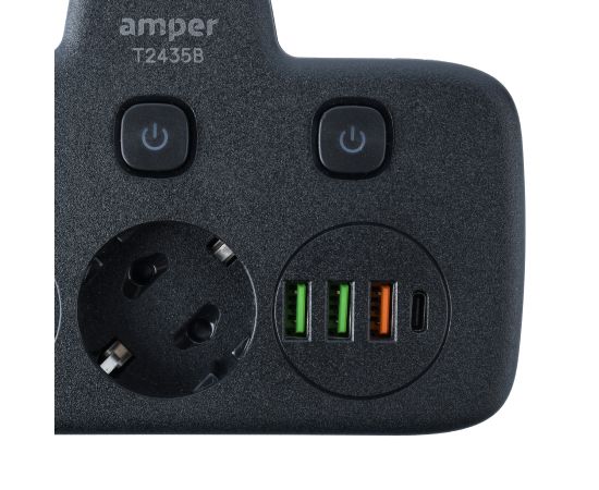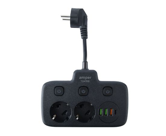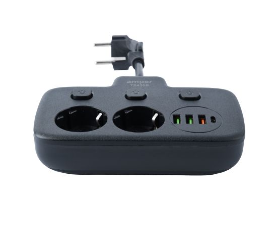 Сетевой удлинитель, Amper 0,2м, 2 розетки, 3*0,75мм, 10А, 2500 Вт, 3usb, 1Type-C, 3кн, черный
