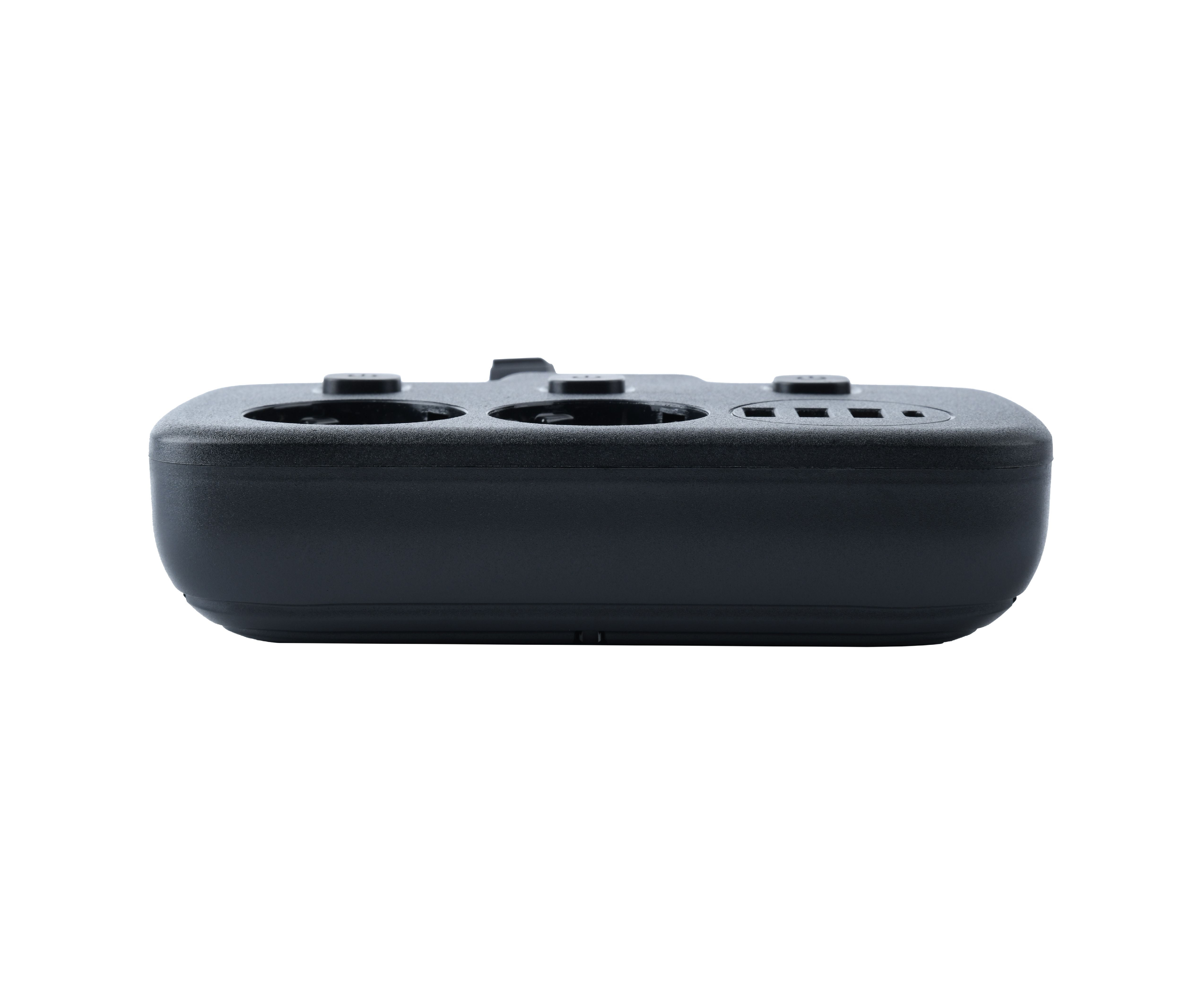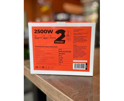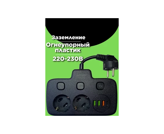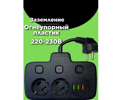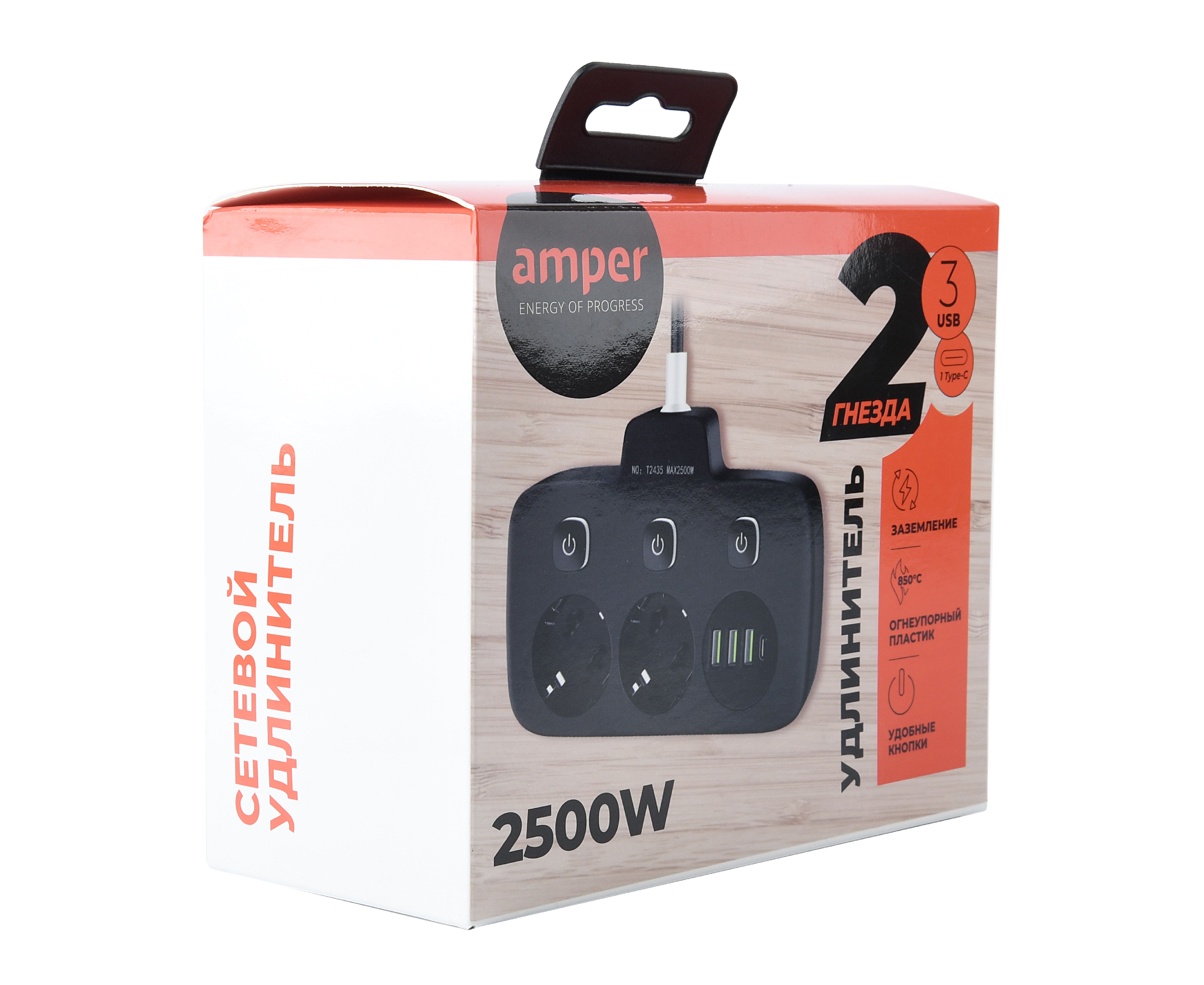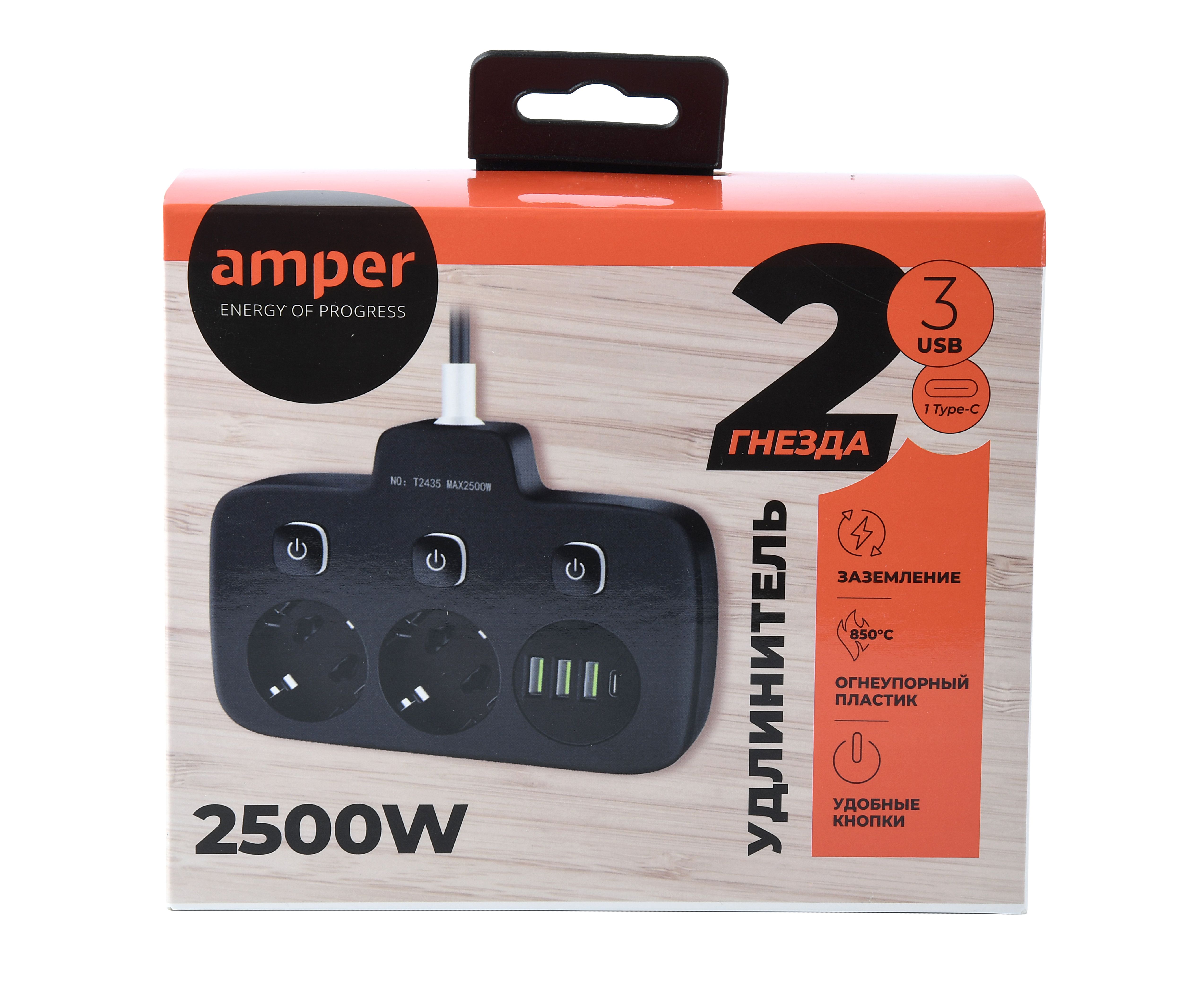 Сетевой удлинитель, Amper 0,2м, 2 розетки, 3*0,75мм, 10А, 2500 Вт, 3usb, 1Type-C, 3кн, черный