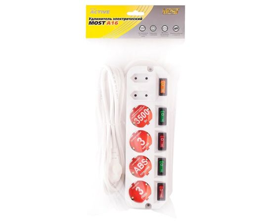 Особенности: Удлинитель Most А16 предназначен для подключения бытовой техники к сети электропитания. У каждой из четырех евророзеток имеется мощный (16A) индивидуальный выключатель,который обеспечивает удобство обращения с электропитанием и экономит ваше время. Две узкие розетки имеют общий выключатель.