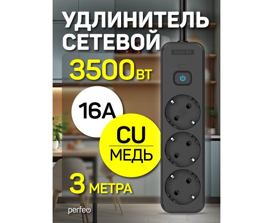 Сетевой удлинитель Perfeo "REAL STRIP" 3,0м, 3 розетки, 16А, 3500 Вт, черный