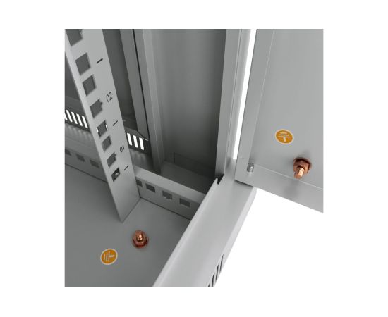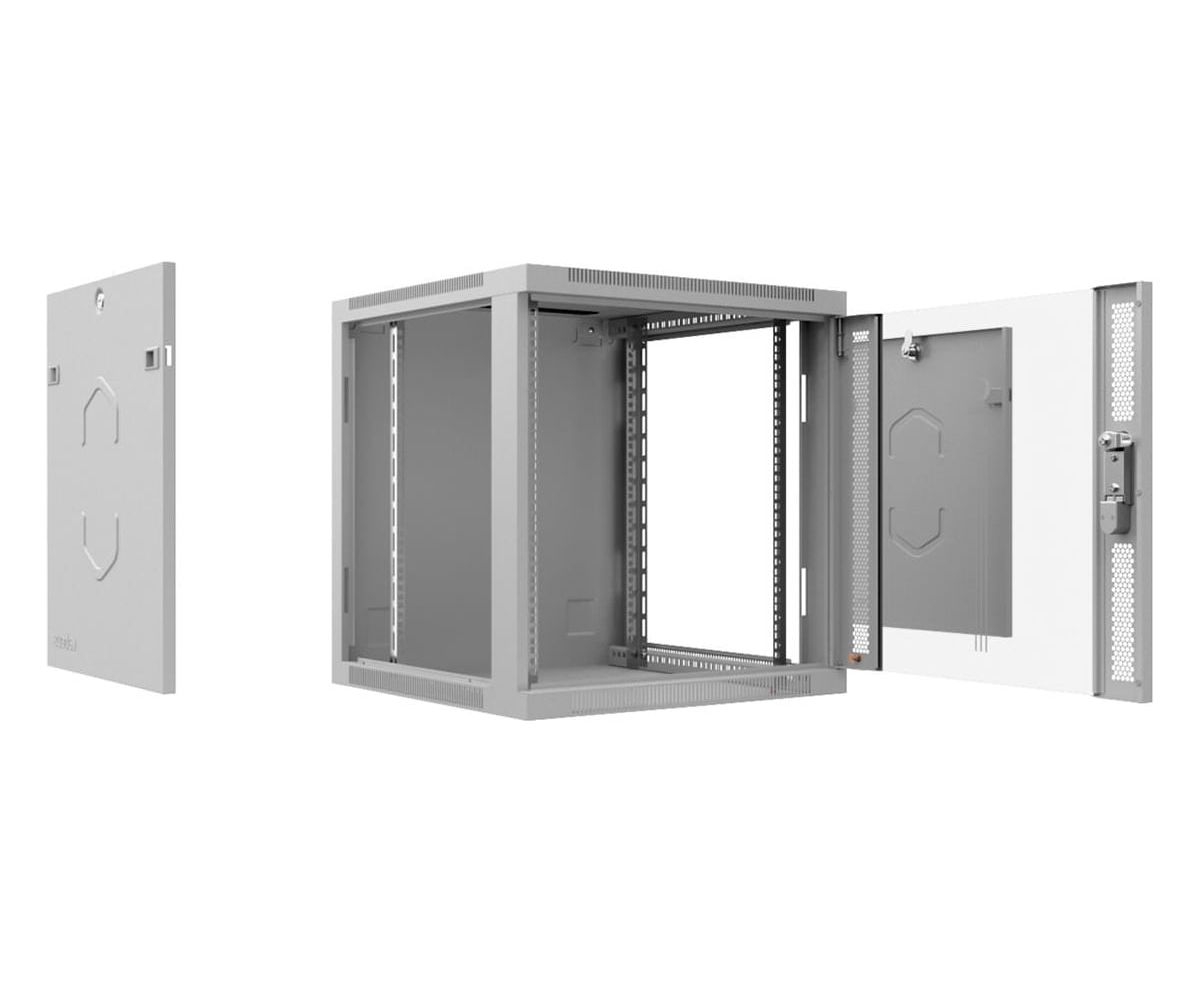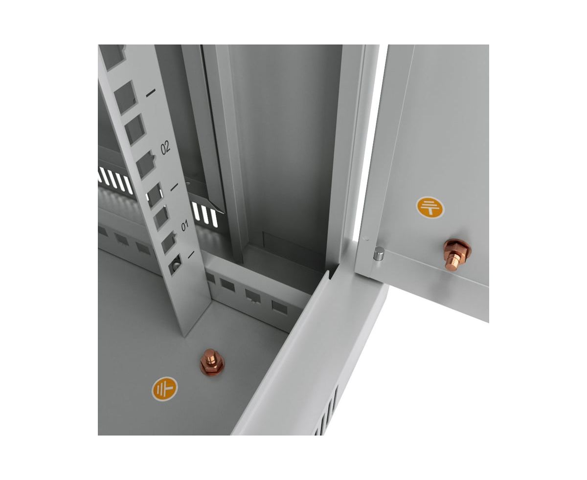 Передняя дверь комплектуется поворотной ручкой с замком. Крыша шкафа имеет перфорацию. Крыша и основание шкафа имеют отверстия для ввода кабеля. Вертикальные направляющие регулируются по глубине. Боковые стенки съемные.