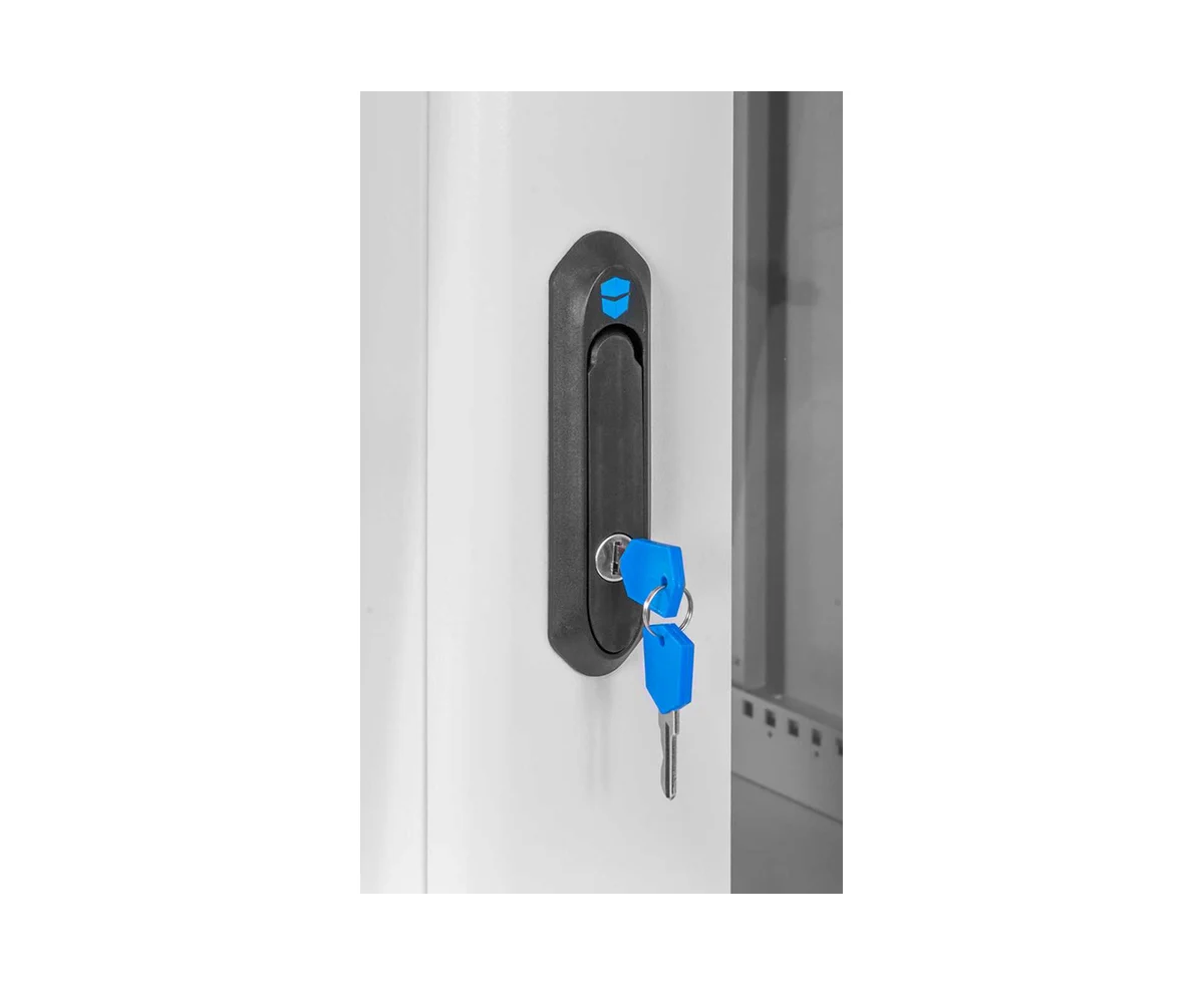 Комплектация с дверью с тонированным ударопрочным стеклом. Новая конструкция стеклянной двери с механическим креплением стекла увеличивает её жесткость, и обеспечивает легкую замену стекла при его повреждении. Возможна установка двери, как с правой, так и с левой стороны. Новый усиленный точечный замок с поворотной ручкой увеличивает жесткость фиксации двери в закрытом положении и защиту от несанкционированного доступа, а также обеспечивает удобство при её открывании.