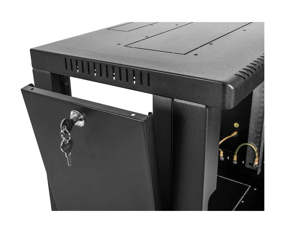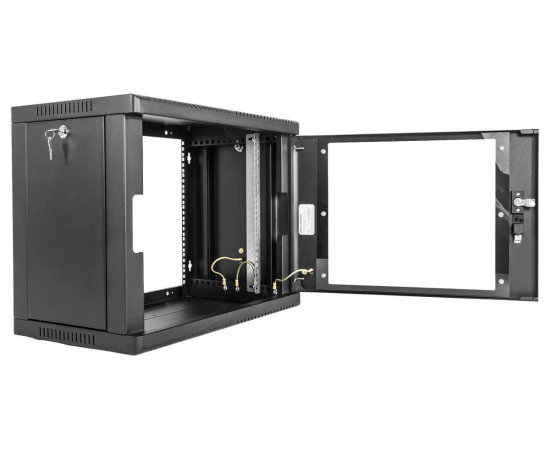 Настенный шкаф 19" ШРН имеет цельнометаллическую сварную конструкцию, он удобен для быстрой установки и монтажа оборудования, так как не требует сборки. Отсутствие острых углов с фронтальной стороны повышают безопасность при эксплуатации и обслуживании шкафов, что помогает исключить человеческие травмы при соприкосновении со шкафом. Комплектация дверью с тонированным ударопрочным стеклом. Новая конструкция стеклянной двери с механическим креплением стекла увеличивает её жесткость, и обеспечивает легкую замену стекла при его повреждении. Возможна установка двери, как с правой, так и с левой стороны. Новый усиленный точечный замок с поворотной ручкой увеличивает жесткость фиксации двери в закрытом положении и защиту от несанкционированного доступа, а также обеспечивает удобство при её открывании.