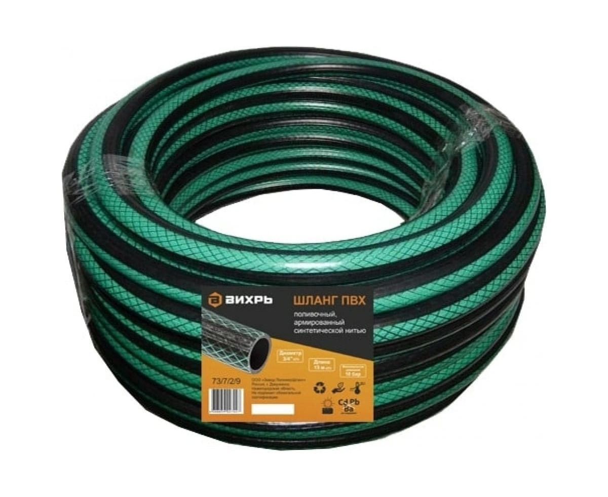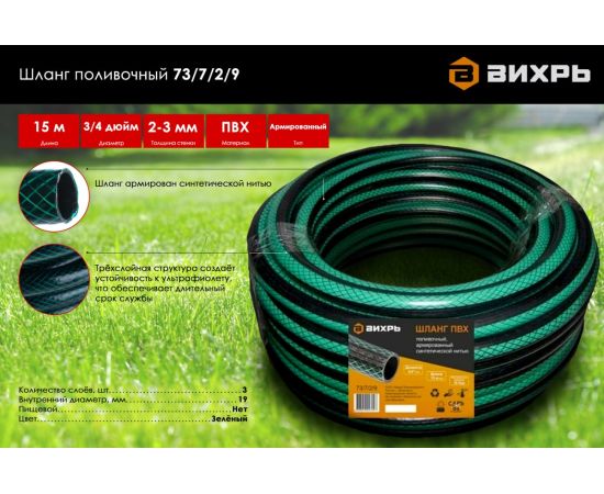Шланг поливочный Вихрь 73/7/2/9 ПВХ трехслойный армированный 3/4, 15м (зелёный)
