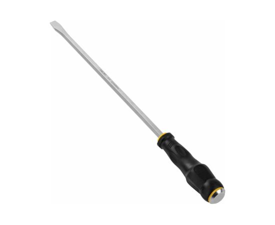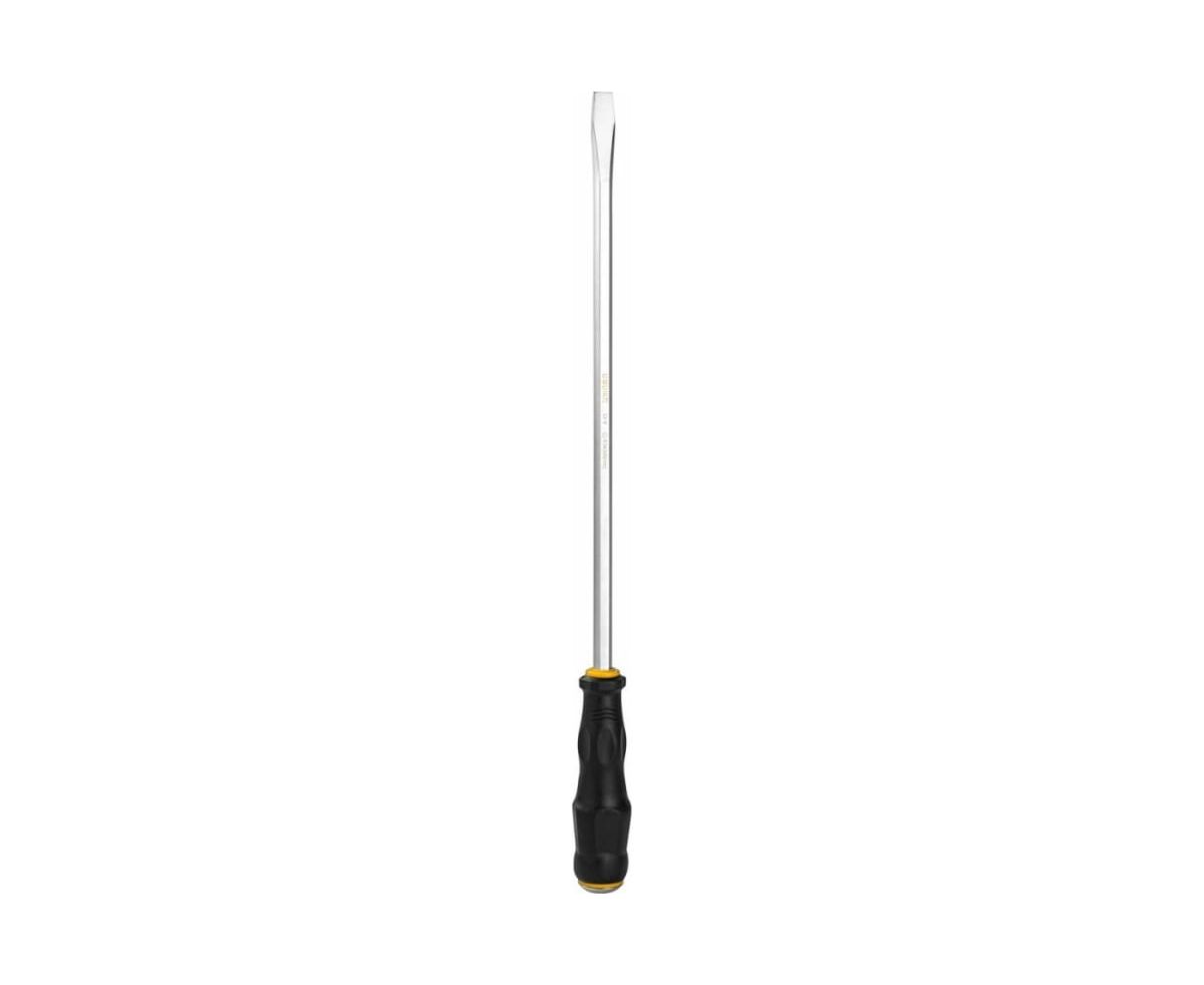 Ударная шлицевая отвертка используется для работ с резьбовыми соединениями в процессе ремонта или монтажа. Металлический затыльник рукоятки позволяет использовать инструмент вместе с молотком в процессе откручивания сложных винтов и гаек. Стержень выполнен из качественной хромованадиевой стали, что обеспечивает высокую антикоррозийную стойкость и долговечность.