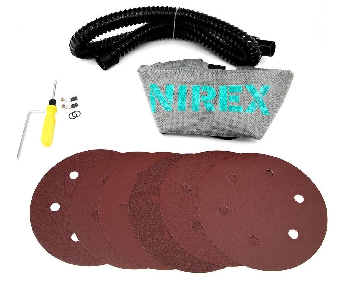 Шлифмашина; Мешок для сбора пыли; Шлифовальные круги - 6 шт.: зернистость Р80/100/120/150/180/240; Боковая ручка; Угольные щетки - 2 шт.; Шестигранный ключ; Отвертка; Шайбы прокладки для шлифовального диска - 2 шт.; Инструкция по эксплуатации; Упаковка (картонная коробка).