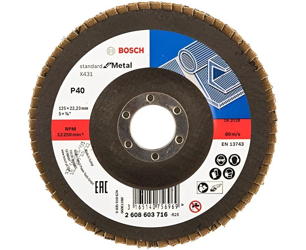 Круг лепестковый 125х22.2 мм K40 плоский STANDARD FOR METAL BOSCH (2608603716) оптимально подходит для обработки нержавеющей стали, стали, чугуна и листовой стали. Высокая производительность благодаря цирконовому корунду/корунду повышенной чистоты, со связующим составом из синтетической смолы, прочная X-ткань. Угловое исполнение – для обработки кромок/сварных швов и шлифования поверхностей с установочным углом 5-15°.