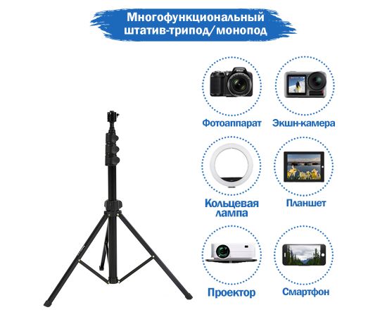 Устойчивый штатив Jmary MT-38 поможет вам снять идеальные фотографии и видеоролики. Это универсальна модель, которая подойдет для студийной фото, видеотехники и держателей с разъемом для крепления 1/4". На стойке можно зафиксировать фотоаппарат, смартфон или камеру, установить кольцевую светодиодную лампу или микрофон. Положение гаджета можно регулировать и выбирать удачный ракурс для съемки, чтобы вы в кадре выглядели идеально. С таким аксессуаром больше не придется переснимать кадр за кадром из-за дрожащих рук. В комплекте со штативом идет держатель для телефона с креплением для вспышки или микрофона. Преимущества напольного штатива для фото/видеокамер: Стойка сделана из надежного и износостойкого материала: металла. Ее вес составляет всего 430 граммов. На нее можно устанавливать гаджеты весом до 1 кг. Благодаря телескопической конструкции высоту штатива можно изменять от 51,5 см до 168 см. У Jmary MT-38 три ноги. Они раздвигаются и фиксируются в одном положении. На каждой ножке имеется прорезиненый наконечник, поэтому стойка устойчиво стоит на любой поверхности, а не скользит. Сверху штатива находится стандартный винт 1/4". На него можно закрепить раздвижной зажим для телефона из комплекта, фотоаппарат или видеокамеру, если в них предусмотрена резьба.