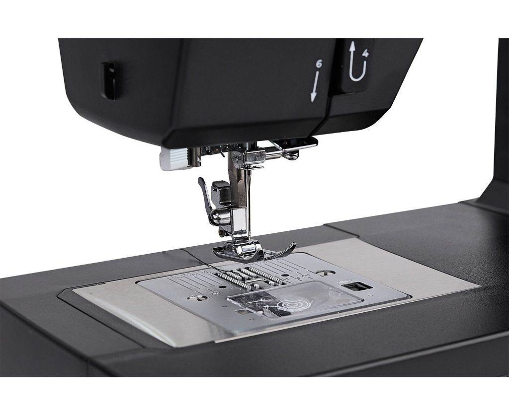 С помощью регулятора скорости шитья можно установить максимальную скорость 800 ст./мин. Кнопкой устанавливается положение иглы: при окончании шитья игла может останавливаться в нижнем положении и удерживать ткань. Используя кнопку Старт/Стоп, можно уверенно шить без педали.