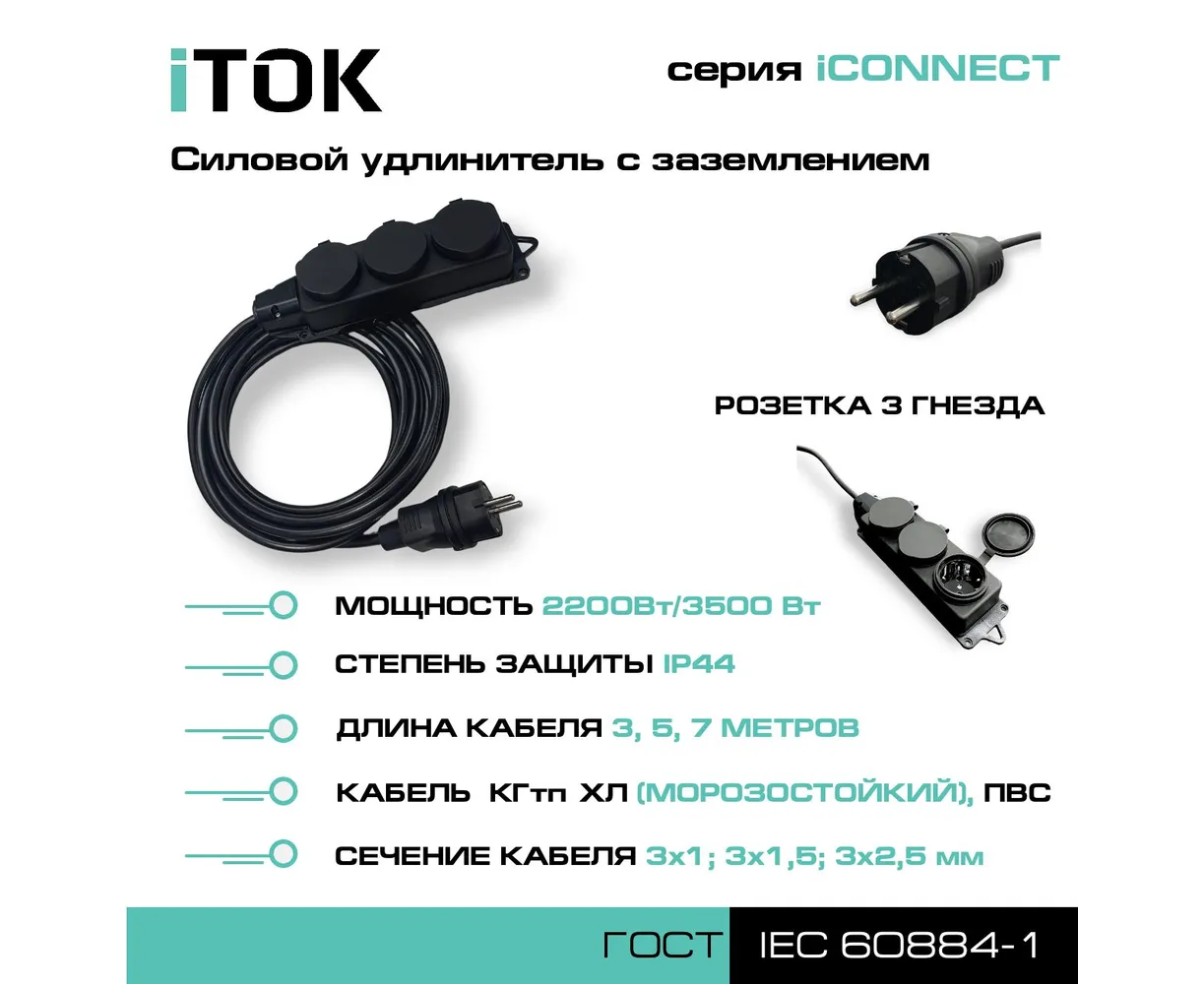 Силовой удлинитель iTOK i-CONNECT-SU-KG-325-3-44-7 с заземлением КГтп-ХЛ 3x2,5мм 3 гнезда IP44 ГОСТ 7м