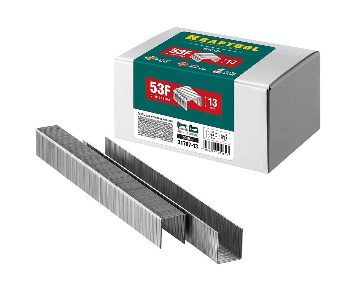 Скобы для степлера тип 20GA (53F/D/056) 13мм, 5000 шт, KRAFTOOL 31787-13 применяются для крепления разных материалов , в том числе, проволочной сетки и тонкого металла к поверхностям из фанеры, дерева, ДСП, с помощью степлера электрического или пневматического.