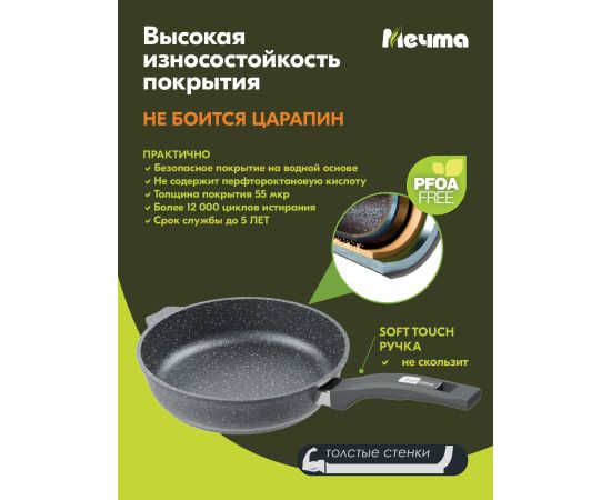 Посуда линейки Гранит от торговой марки Мечта подходит для газовых, электрических, стеклокерамических плит, мытья в посудомоечной машине (согласно инструкции по эксплуатации).