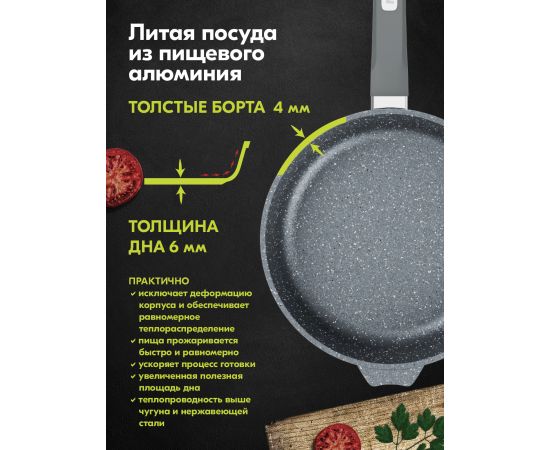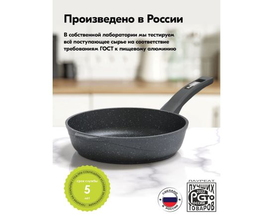 Сковорода линия Гранит с антипригарным покрытием Greblon, которое является полностью безвредным для вашего здоровья при готовке ваших любимых блюд.
