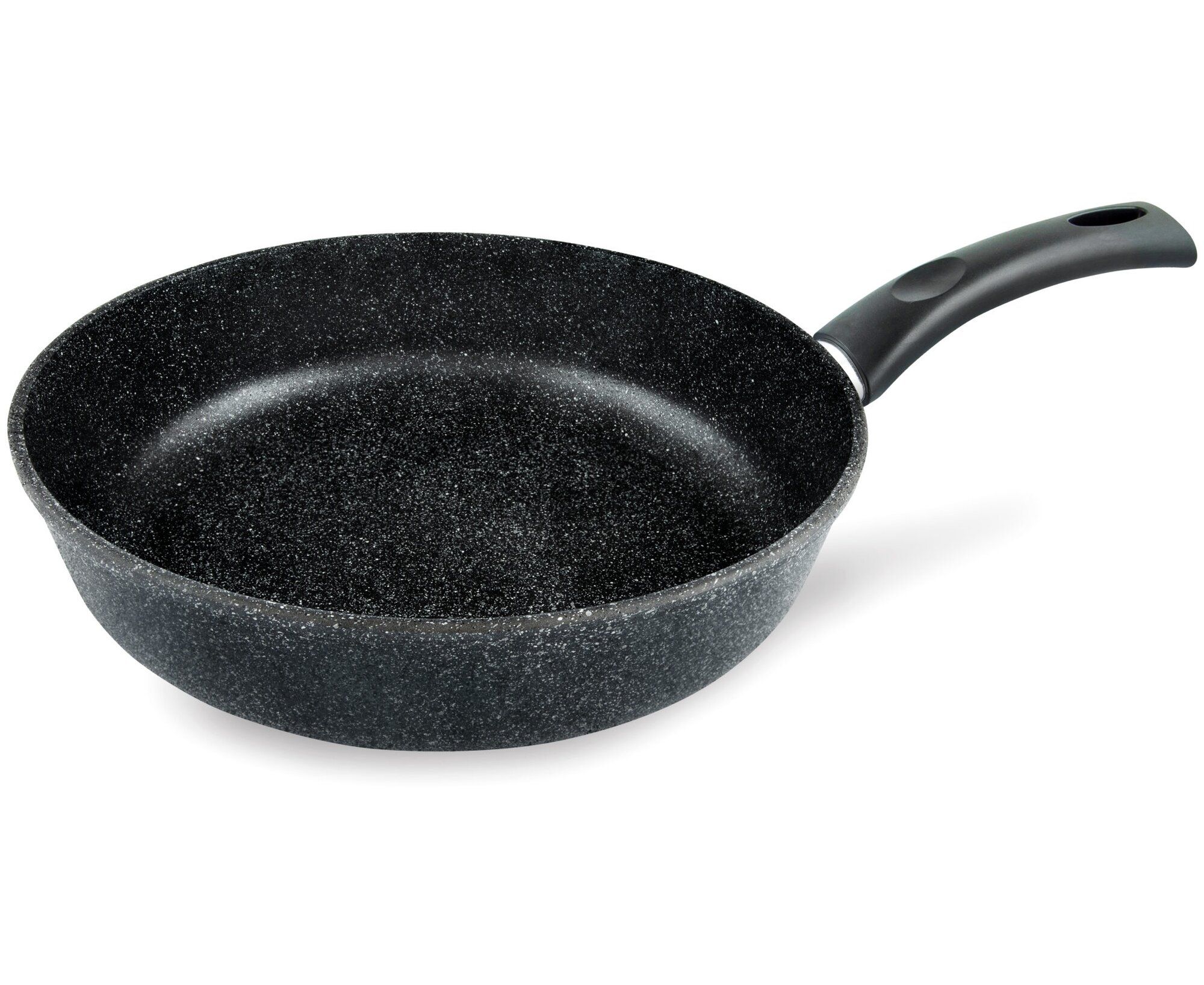 Сковорода обладает диаметром 22 см и станет надежной помощницей для ежедневного приготовления домашней пищи. Дно с цельным ферромагнитным диском распознается всеми типами индукционных плит и способствует быстрому разогреву. Корпус из литого алюминия гарантирует устойчивость посуды к механическим повреждениям и деформации. Внутреннее антипригарное покрытие с эффектом натурального камня позволяет готовить с небольшим количеством масла и повышает удобство в эксплуатации. Сковорода оборудована ненагревающейся ручкой из бакелита и подходит для мытья в посудомоечной машине.