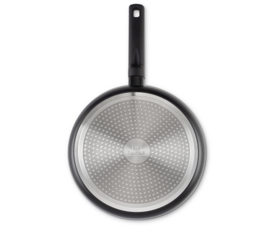 Изготовлено из кованого алюминия. Толщина стенок – 2,8 мм, дна – 3,5 мм. Прочное внутреннее двухслойное покрытие имеет превосходные антипригарные свойства. Не содержит PFOA. Безопасно для здоровья. Рекомендуется ручная мойка во избежание повреждения soft touch покрытия на аксессуарах.