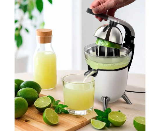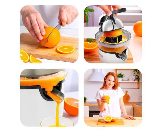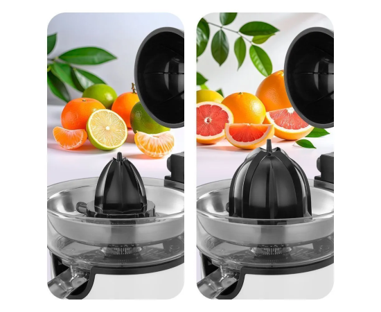 В комплекте с соковыжималкой идут два конуса: маленький и большой. Они позволяют быстро выжать сок из цитрусовых, сохраняя полезные вещества. Маленький конус подходит для лимонов и лаймов, большой — для апельсинов и грейпфрутов