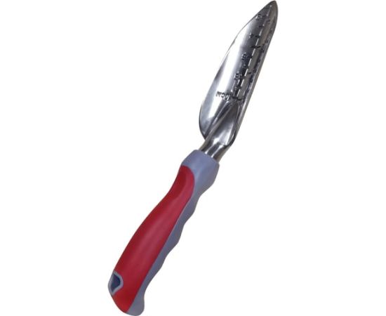 Подходит для пересадки растений, узкое лезвие помогает сохранить корни. Сделан из алюминия с защитным покрытием против ржавчины и налипания. Ручка удобная, не скользкая.