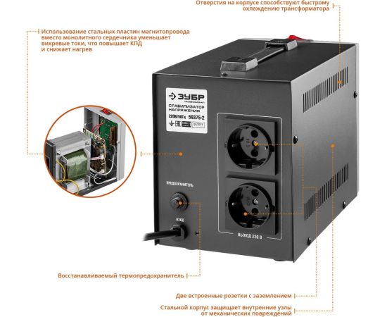 Особенности: Стабилизатор напряжения ЗУБР предназначен для точного и быстрого выравнивания сетевого напряжения для защиты бытовой техники и оборудования. Устройство обеспечивает эффективную защиту электроприборов от нестабильного по значению напряжения в сети. Релейный тип стабилизации.
